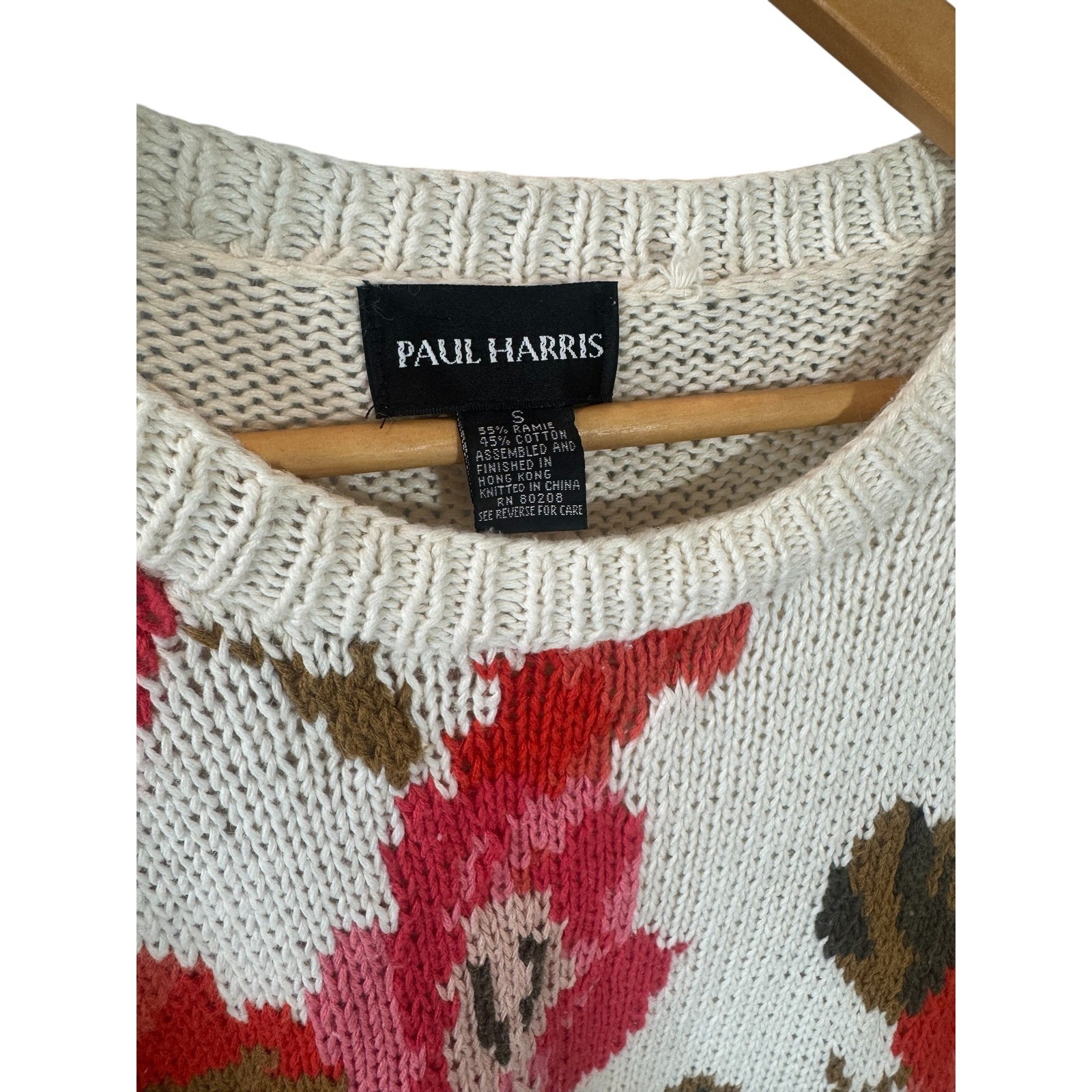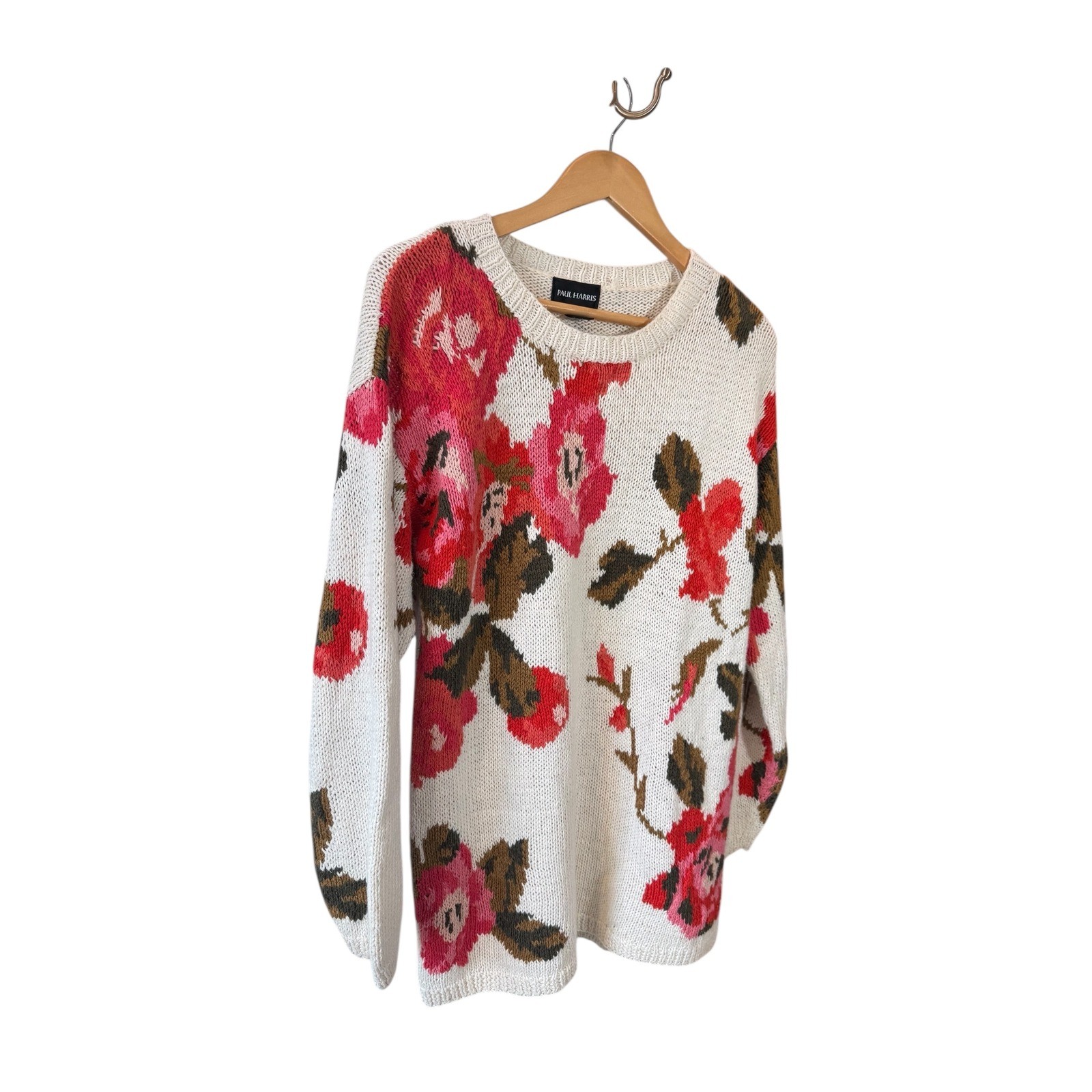 Blossoming beauty arrives with this Paul Harris floral knit sweater. Adorned with a vibrant bouquet of red and pink roses contrasted with deep brown foliage against a creamy, neutral backdrop, this sweater brings a touch of garden charm to your wardrobe. The intricate knit provides both warmth and texture, making it a comfortable yet stylish choice. With its relaxed fit and classic crewneck, it's an effortlessly chic piece that pairs well with a variety of outfits. Imagine wearing this sweater for a casual weekend brunch, a cozy evening by the fireplace, or a relaxed stroll through the park. Measurements: Armpit-Armpit 20", Length 29" Style: Pullover Color: White Department: Women Type: Sweater Material: Cotton Blend, Ramie Sleeve Length: Long Sleeve Neckline: Crew Neck Features: Floral Print, Knit, Relaxed Fit, All Seasons Pattern: Floral Sleeve Type: Raglan Sleeve Fabric Type: Knit Accents: Knit Keywords: Paul Harris, Floral Sweater, Knit Sweater, Womens Sweater, Crewneck Sweater, Bohemian Sweater, Cottagecore, Roses, Floral Print, Relaxed Fit, Casual Sweater, Spring Sweater, Fall Sweater