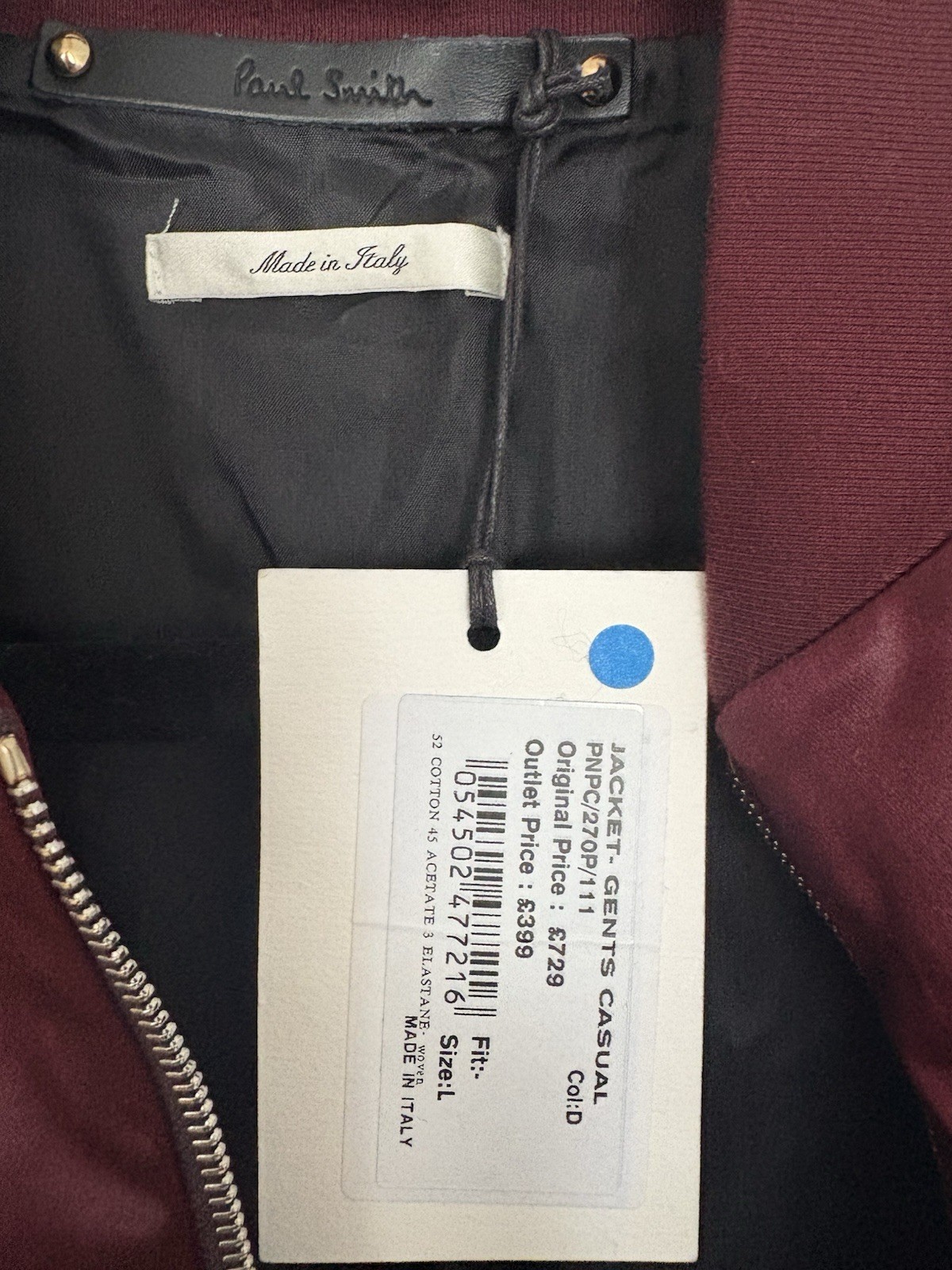 The Paul Smith Bomber Jacket in size L is a stylish and casual option for men looking for a designer piece. Made from cotton with a zip closure, this burgundy jacket features the iconic Paul Smith brand and is perfect for everyday wear. The bomber style adds a touch of edge to any outfit, making it a versatile addition to any wardrobe. Ideal for walking and other casual activities, this regular fit jacket is a must-have for those who appreciate quality and style.