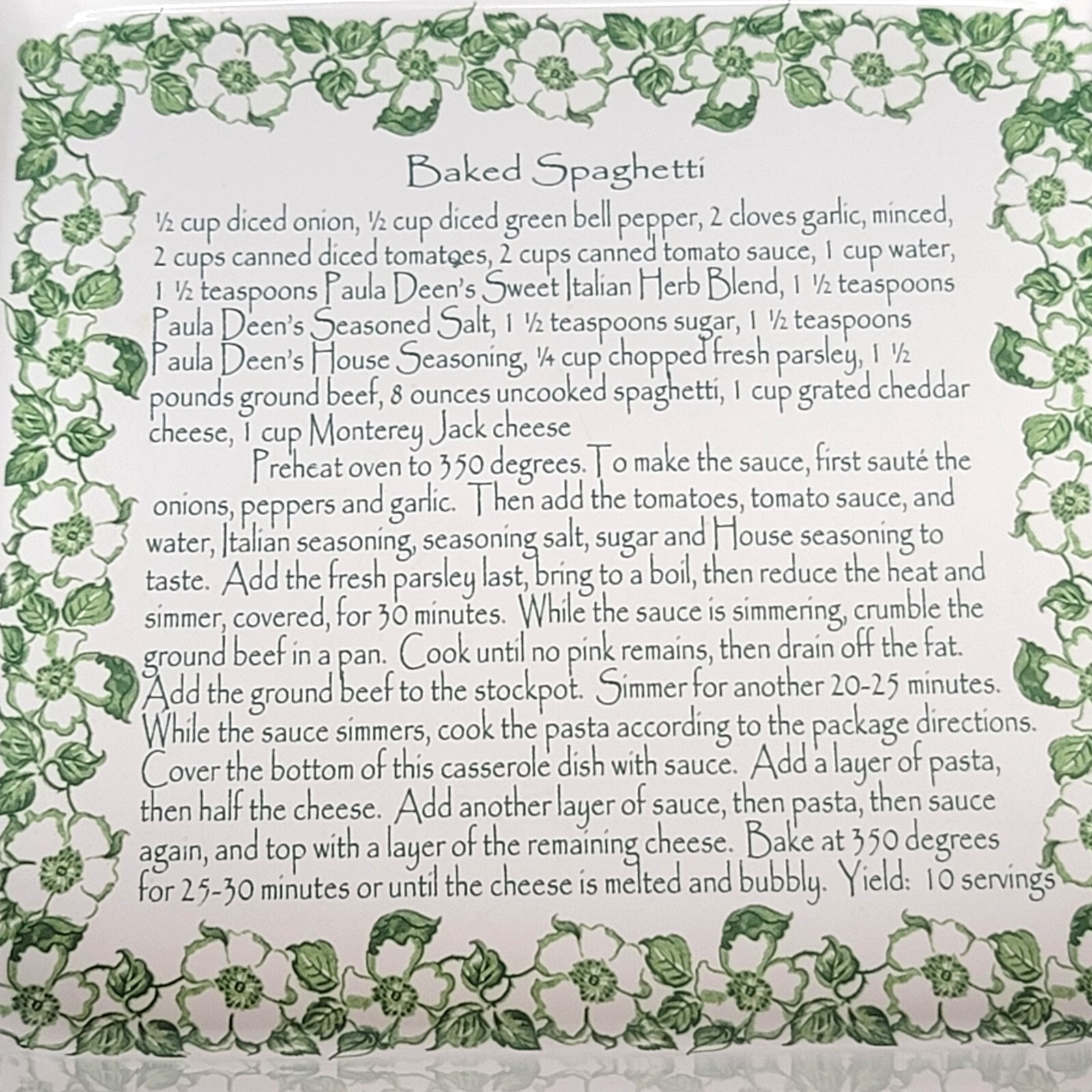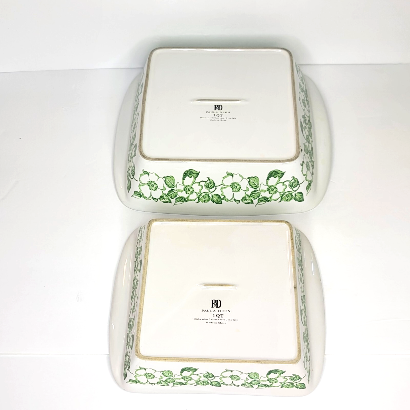 Paula Deen 1 & 2 Qt Baking Dish Casserole & Spaghetti Recipe Pan White and Green Flowers Retired The Paula Deen 1 & 2 Qt Baked Dish Casserole & Spaghetti Recipe Pan in White with green flowers is a two-piece set that includes a 1 qt casserole and a 2 qt casserole. These oven-safe dishes are compatible with electric, gas, and microwave ovens, making them versatile for various cooking needs. The ceramic surface coating ensures easy cleaning and even cooking, perfect for creating delicious casseroles and spaghetti dishes with the trusted Paula Deen brand. We offer Fast Shipping! We are a small family-owned business, and we truly appreciate your support. To help protect the environment, we use recycled and eco-friendly packaging materials whenever possible—carefully packing your item while reducing waste.