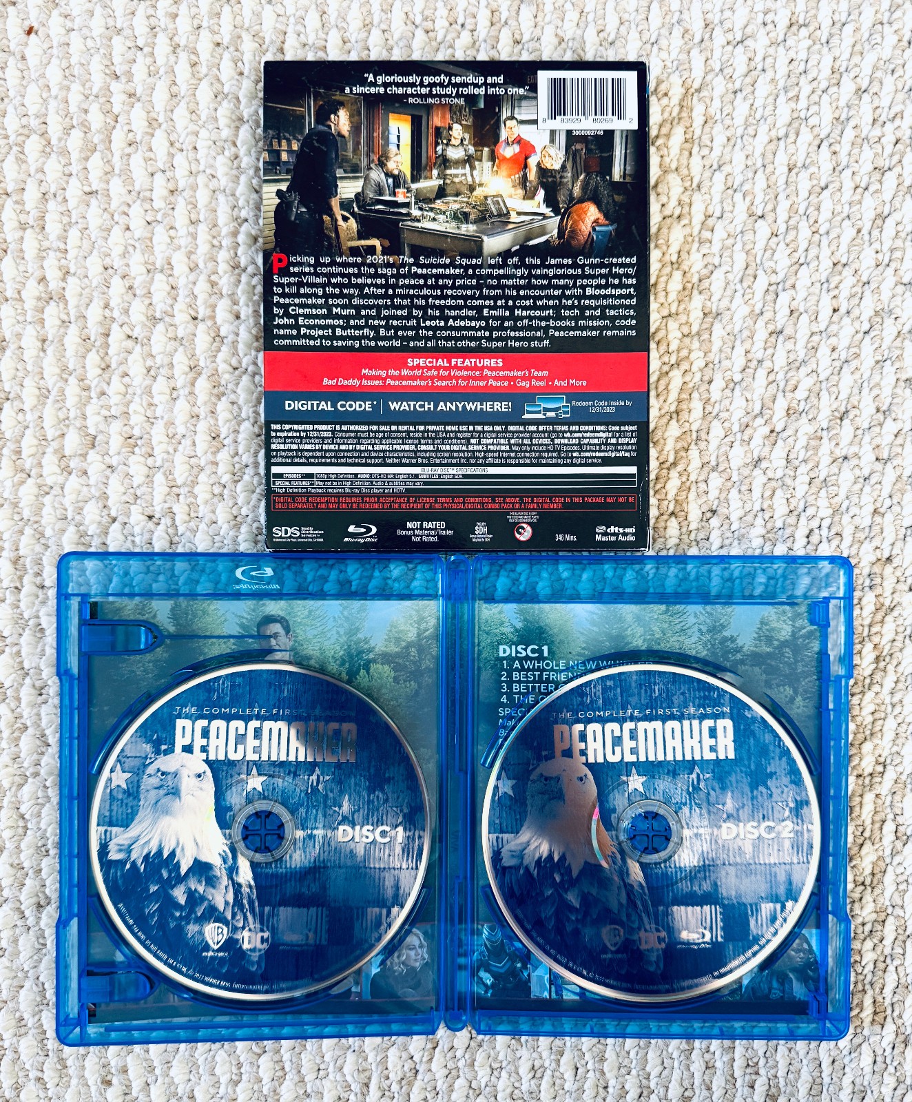Discs in very good condition, exactly as pictured. USA Region Free release. Includes Slipcover Peacemaker: The Complete First Season Blu-ray Video Codec: MPEG-4 AVC Resolution: 1080p Aspect ratio: 1.78:1 Original aspect ratio: 1.78:1 Audio English: DTS-HD Master Audio 5.1 (48kHz, 16-bit) Subtitles English SDH, Mandarin (Traditional) Discs Blu-ray Disc Two-disc set (2 BD-50) Playback 2K Blu-ray: Region free