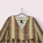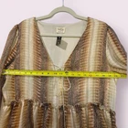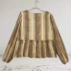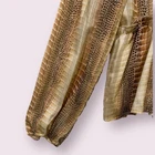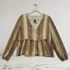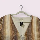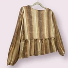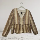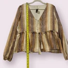 Elevate your wardrobe with this stunning Peach Love California Peplum top. The eye-catching metallic snakeskin print and tie neck accents make it perfect for any occasion, whether it's casual, workwear, or even a party or cocktail event. The blouse features long balloon sleeves and a V-neckline, adding a touch of elegance to the lightweight design that makes it perfect for any event. Don't miss out on this beautiful piece that is sure to suit any wardrobe! Size Medium See Pics For Measurements Make sure to Compare Measurements to items you already own & love to ensure a Good Fit before placing an order & for best buying experience ! We Ship out all purchases within 1 business day of payment. Automatic $10 flat Rate Combined Shipping on all items added to cart & paid for together in 1 order. 30 day Free Returns just in case you don’t Love it ! Happy Shopping 😊