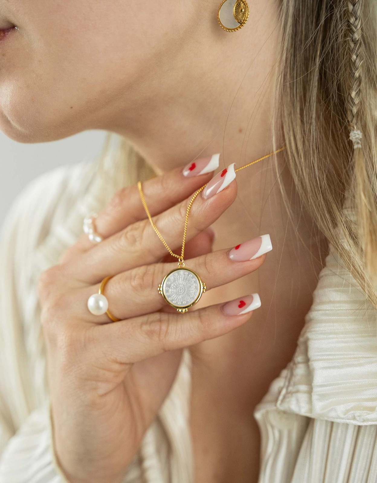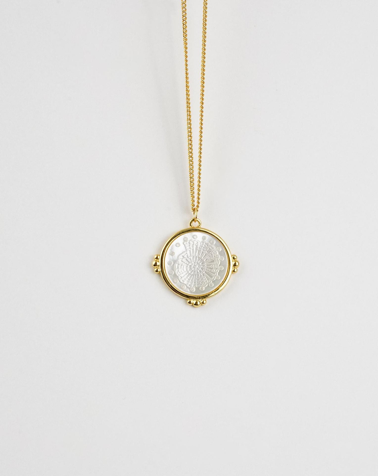 Enhance Your Style with the Sea Shell Print Pearl Necklace Elevate your style with our Sea Shell Print Pearl Necklace. Featuring a delicate sea shell print design, this stunning necklace is crafted with lustrous pearls that add a touch of sophistication. Perfect for any occasion, it's a must-have in your jewellery collection. Key Features: Gemstones: Mother of Pearl Diameter: 19mm Curb Chain Thickness: 1.2mm Curb Chain Length: 40+5cm Extender