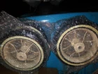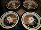 4 hard to find wire wheels. Looks good on custom built pedal cars. This set includes 4 white wall tires and wire rims. You can paint, chrome, gold plate, engrave these rims to add xtra Bling to your pedal car project. Wheels with tires are 6 1/2" wide. Comes with the Red end caps. Tires are white walls. Instructions included on how to remove and replace tires from rims. Custom pedal car NOT included. Shipping to the lower 48 states Look at my other custom Lowrider parts for sale.