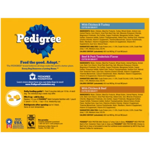 Important Note for Our Valued Customers: To offer you the best prices with free shipping, we occasionally experience shipping delays. If this happens, we’ll notify you immediately, issue a full refund, and invite you to place a new order at your convenience. To keep costs low, we sometimes reuse branded packaging boxes for shipments—we appreciate your understanding if you receive your order in repurposed packaging. Rest assured, all products we sell are 100% brand new, unopened, and freshly manufactured, including pet food and human-grade items, with a minimum 8-month shelf life remaining. If any issues arise, please contact us first—we’re committed to resolving them quickly. If you’re not completely satisfied, we offer a full refund with no hassle. Thank you for your trust and support! Description Dogs bring out the good in us. Pedigree brings out the good in them. Express your love for your dog by serving Pedigree High Protein Adult Wet Dog Food 18-Count Variety Pack. These great-tasting wet dog food recipes are 100% complete and balanced food for adult dogs and are made with real beef, chicken, and turkey, bringing a filling and familiar flavor to mealtime. Pedigree High Protein Adult Wet Dog Food 18-Count Variety Pack features three delicious options: With Chicken & Turkey Cuts In Gravy, Beef & Pork Tenderloin Flavor Cuts In Gravy, and With Chicken & Beef Cuts In Gravy. Made to be versatile, this soft dog food can be served as a topper, mixed with dry dog food, or enjoyed by itself as a complete meal for adult dogs, bringing your dog a variety of ways to indulge. Crafted with no high fructose corn syrup, artificial flavors, or added sugars, although trace amounts may be present due to potential cross-contact at manufacturing, Pedigree High Protein Adult Wet Dog Food, 18-Count Variety Pack Flavor shows your dog that you care and want them to have great tasting food. highlights Made with Real Meat or Poultry: Pedigree High Protein Adult Wet Dog Food 18-Count Variety Pack is made with real beef, chicken or turkey, serving a flavor your dog will love. 100% Complete and Balanced For Adult Dogs: Pedigree High Protein Adult Wet Dog Food 18-Count Variety Pack is 100% complete and balanced food for adult dogs, keeping your dog full and happy. Mix-it-Up: These soft dog food recipes can be served as a topper, mixed with dry dog food, or as a complete meal for adult dogs, bringing your dog a variety of ways to enjoy. Quality Recipe: This soft dog food contains no added sugar, no high fructose corn syrup and no artificial flavors. Zero Factory Waste to Landfill: Pedigree High Protein Adult Wet Dog Food 18-Count Variety Pack is made in factories committed to zero waste to landfill. 18-Count: Pedigree High Protein Adult Wet Dog Food Variety Pack contains six (6) 3.5 oz. With Chicken & Turkey Cuts In Gravy, six (6) Beef & Pork Tenderloin Flavor Cuts In Gravy, and six (6) With Chicken & Beef Cuts In Gravy. Ingredients: with chicken & beef, cuts in gravy, ingredients: sufficient water for processing, chicken, meat by-products, wheat gluten, animal plasma, animal liver, beef, corn starch, plain dried beet pulp, added color, salt, minerals (potassium chloride, magnesium proteinate, zinc sulfate, copper proteinate, manganese sulfate, copper sulfate, potassium iodide), sodium tripolyphosphate, natural smoke flavor, xanthan gum, guar gum, vitamins (choline chloride, vitamin e supplement, thiamine mononitrate, calcium pantothenate, biotin, riboflavin supplement, vitamin a supplement, vitamin d3 supplement, vitamin b12 supplement)