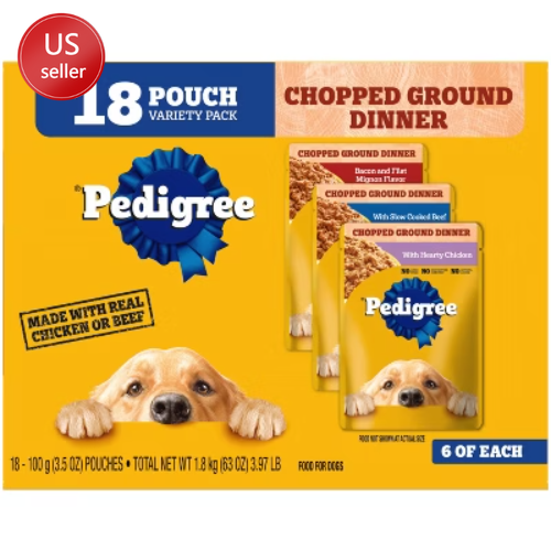 Important Note for Our Valued Customers: To offer you the best prices with free shipping, we occasionally experience shipping delays. If this happens, we’ll notify you immediately, issue a full refund, and invite you to place a new order at your convenience. To keep costs low, we sometimes reuse branded packaging boxes for shipments—we appreciate your understanding if you receive your order in repurposed packaging. Rest assured, all products we sell are 100% brand new, unopened, and freshly manufactured, including pet food and human-grade items, with a minimum 8-month shelf life remaining. If any issues arise, please contact us first—we’re committed to resolving them quickly. If you’re not completely satisfied, we offer a full refund with no hassle. Thank you for your trust and support! Description PEDIGREE CHOPPED GROUND DINNER is the wet dog food that delivers the taste dogs crave with the nutrition they need. This variety pack features three delicious flavors: With Hearty Chicken, With Slow Cooked Beef, and Bacon and Filet Mignon Flavor. This easy-to-chew ground texture makes a tasty meal for adult dogs of all sizes and provides the perfect balance of vitamins and minerals with no artificial flavor, no added sugar, and no high fructose corn syrup. Each dog wet food recipe is 100% complete and balanced for adult canines, so you know they’re getting the most out of their diet. Serve as a topper, a mixer with dry dog food, or a complete meal! Feed your dog nutritious food for a healthy, happy life with PEDIGREE Pouches. highlights 100% Complete and Balanced Food For Adult Dogs: Pedigree Chopped Ground Dinner Dog Food 18-Count Bacon Filet Mignon Variety Pack is 100% complete and balanced food for adult dogs, keeping your dog full and happy. Quality Recipe: These soft dog food recipes contain no added sugar, no high fructose corn syrup, and no artificial flavors. Mix-it-Up: These wet dog food recipes can be served as a topper, mixed with dry dog food, or as a complete meal for adult dogs, bringing your dog a variety of ways to enjoy. Zero Factory Waste to Landfill: Pedigree Chopped Ground Dinner Dog Food 18-Count Bacon Filet Mignon Variety Pack is made in factories committed to zero waste to landfill. 18-Count: Pedigree Chopped Ground Dinner Dog Food 18-Count Bacon Filet Mignon dog wet food variety pack contains six (6) 3.5 oz. Pouches of With Hearty Chicken, six (6) With Slow Cooked Beef, and six (6) Bacon, filet Mignon Flavors. Amount Bacon and Filet Mignon Flavor: % Daily Value* Crude Protein (Min) 8% Crude Fat (Min) 6% Crude Fiber (Max) 1% Moisture (Max) 78% * Percentage of Daily Values are based on a 2,000 calorie diet. Amount With Slow Cooked Beef: % Daily Value* Crude Protein (Min) 8% Crude Fat (Min) 6% Crude Fiber (Max) 1% Moisture (Max) 78% * Percentage of Daily Values are based on a 2,000 calorie diet. Amount With Hearty Chicken: % Daily Value* Crude Protein (Min) 8% Crude Fat (Min) 6% Crude Fiber (Max) 1% Moisture (Max) 78% * Percentage of Daily Values are based on a 2,000 calorie diet. Ingredients: with hearty chicken - chicken, sufficient water for processing, meat by-products, animal liver, minerals (potassium chloride, magnesium proteinate, zinc sulfate, copper proteinate, manganese sulfate, copper sulfate, potassium iodide), carrageenan, sodium tripolyphosphate, dried yam, xanthan gum, vitamins (choline chloride, vitamin e supplement, thiamine mononitrate, calcium pantothenate, biotin, riboflavin supplement, vitamin a supplement, vitamin d3 supplement, vitamin b12 supplement), natural flavor, guar gum, sodium nitrite (for color retention), with slow cooked beef - chicken, sufficient water for processing, meat by-products, animal liver, beef, minerals, minerals (potassium chloride, magnesium proteinate, zinc sulfate, copper proteinate, manganese sulfate, copper sulfate, potassium iodide), added color, carrageenan, sodium tripolyphosphate, dried yam, natural smoke flavor, vitamins (choline chloride, vitamin e supplement, thiamine mononitrate, calcium pantothenate, biotin, riboflavin supplement, vitamin a supplement, vitamin d3 supplement, vitamin b12 supplement), xanthan gum, guar gum, sodium nitrite, bacon and filet mignon flavor - chicken, sufficient water for processing, meat by-products, animal liver, beef, bacon, minerals (potassium chloride, magnesium proteinate, zinc sulfate, copper proteinate, manganese sulfate, copper sulfate, copper proteinate, manganese sulfate, copper sulfate, potassium iodide), carrageenan, added color, sodium tripolyphosphate, dried yam, natural filet mignon flavor, xanthan gum, vitamins (choline chloride, vitamin e supplement, vitamin d3 supplement, vitamin b12 supplement), guar gum, sodium nitrite (for color retention)