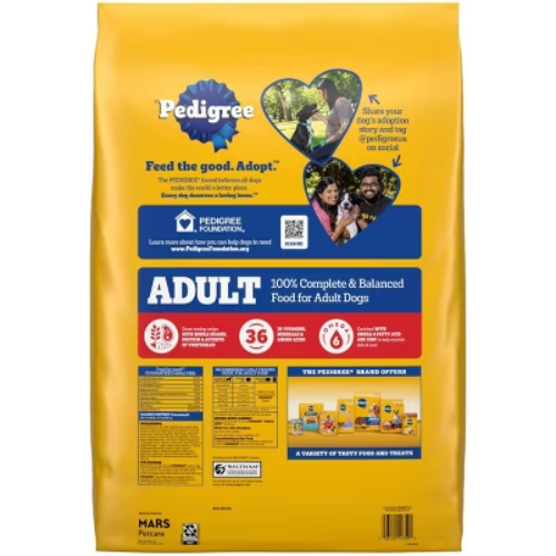 Description Dogs bring out the good in us. Pedigree brings out the good in them. Express your love for your dog by serving Pedigree Complete Nutrition Adult Dry Dog Food, Grilled Steak & Vegetable Flavor. This 100% complete and balanced adult dry dog food recipe is great-tasting and contains whole grains, protein, and accents of vegetables, bringing your dog a meal with quality nutrition that keeps them happy. To support your dog’s health and vitality, this dry dog food recipe is formulated with 36 vitamins, minerals, and amino acids. It also contains Omega 6 Fatty Acid and Zinc to help nourish a healthy skin and coat. With no high fructose corn syrup, artificial flavors, or added sugars, Pedigree Complete Nutrition Adult Dry Dog Food, Grilled Steak & Vegetable Flavor shows your dog that you care…and have great taste. highlights Great Tasting: Pedigree Complete Nutrition, Adult Dry Dog Food, Grilled Steak & Vegetable Flavor is a great-tasting dry dog food recipe with whole grains, protein, and accents of vegetables. Quality Nutrition: This dry dog food recipe is made with 36 vitamins, minerals, and amino acids to support your dog’s health and vitality; Crafted with no high fructose corn syrup, artificial flavors, or added sugar. Supports Healthy Skin and Coat: This dry dog food recipe is enriched with Omega 6 Fatty Acid and Zinc to help nourish a healthy skin and coat. Complete and Balanced: Pedigree Complete Nutrition Adult Dry Dog Food, Grilled Steak & Vegetable Flavor is 100% complete and balanced food for adult dogs, bringing a nutritious meal to your pet. Make it a Merry Pet Christmas for your pet with flavors crafted for holiday joy! Deck the bowls and fill them with our real steak and beef ingredients! Contains one (1) 18 lb. Bag of Pedigree Complete Nutrition Adult Dry Dog Food, Grilled Steak & Vegetable Flavor. Ingredients: ground whole grain corn, meat and bone meal, soybean meal, animal fat (source of omega 6 fatty acids [preserved with bha and citric acid]), ground whole grain wheat, corn protein meal, natural flavor, dried plain beet pulp, salt, bha (preservative), citric acid (preservative), potassium chloride, choline chloride, dl-methionine, calcium carbonate, dried peas, natural grilled steak flavor, zinc sulfate, vitamin e supplement, l-tryptophan, red 40, dried carrots, yellow 6, niacin supplement (vitamin b3), blue 2, d-calcium pantothenate (vitamin b5), copper sulfate, sodium selenite, potassium iodide, yellow 5, vitamin a supplement, riboflavin supplement (vitamin b2), vitamin b12 supplement, thiamine mononitrate (vitamin b1), vitamin d3 supplement, pyridoxine hydrochloride (vitamin b6), folic acid.
