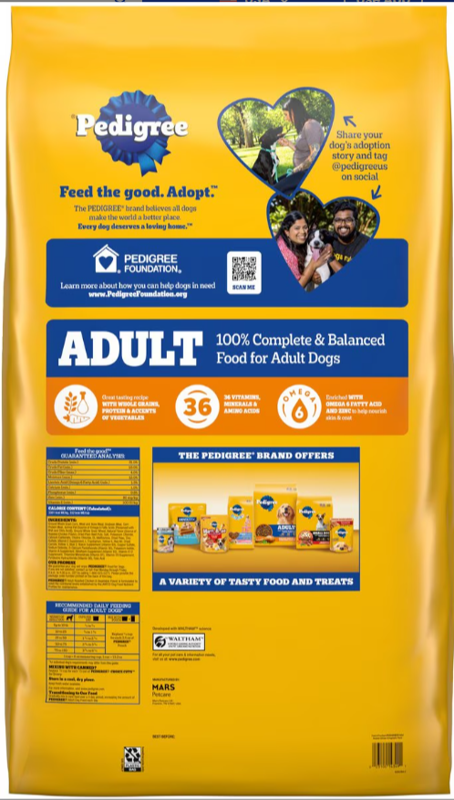 This great-tasting dry dog food recipe comes with whole grains, protein, and accents of vegetables. Made with 36 vitamins, minerals, and amino acids to support your furry friend’s health and vitality. Enriched with omega-6 fatty acids and zinc to help nourish a healthy skin and coat. 100% complete and balanced food for adult dogs, bringing a nutritious meal to your pet. Crafted with no high-fructose corn syrup, artificial flavors, or added sugar. Dogs bring out the good in us; Pedigree brings out the good in them. Express your love for your furry friend by serving Pedigree Complete Nutrition Adult Dry Dog Food, Roasted Chicken & Vegetable Flavor. This 100% complete and balanced adult dry dog food recipe is great tasting and contains whole grains, protein, and accents of vegetables, bringing your canine companion a meal with quality nutrition that keeps them happy. To support your furry loved one’s health and vitality, this dry dog food recipe is formulated with 36 vitamins, minerals, and amino acids. It also contains omega-6 fatty acids and zinc to help nourish a healthy skin and coat. With no high-fructose corn syrup, artificial flavors, or added sugars, Pedigree Complete Nutrition Adult Dry Dog Food, Roasted Chicken & Vegetable Flavor shows your furbaby that you care—and have great taste. Specifications Item Number 362466 Weight 44 pounds Packaging Type Bag Made In United States Sourced From Various Lifestage Adult, All Lifestages Breed Size All Breeds Food Form Dry Food Special Diet With Grain