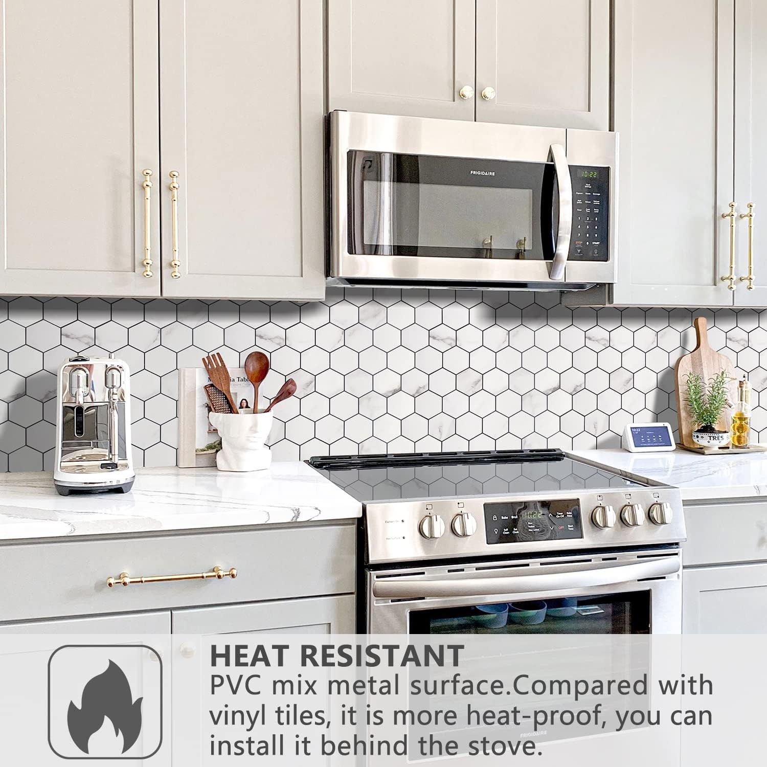 About this item Super Strong Adhesive: This peel and stick tile backsplash features a strong backing glue, so please confirm the installation position, otherwise it will be difficult to tear and cause waste. Premium Kitchen Backsplash: Made of PVC composite laminate, color fadeless, anti-scratch, easy to maintain, more strong and durable than plastic self-adhesive tiles. Geometric hexagons add different elegance and sophistication to your life. Waterproof & Heat Resistant: Realistic marble texture, widely used in kitchen island walls, bathroom backsplash, shower, fireplace, RV, and installed behind the stove. Easy Do It Yourself: Just peel, interlock and stick, easy to cut with a sharp utility knife. No need to overlap, no grout, and no mess, saving you time and money on labor. What You Will Get: 10 sheets of peel and stick tiles, a pack of tile spacers. It is advisable to purchase at least 10% more tiles to accommodate any design adjustments and pattern alignment. Size: 12"L x 12"W.