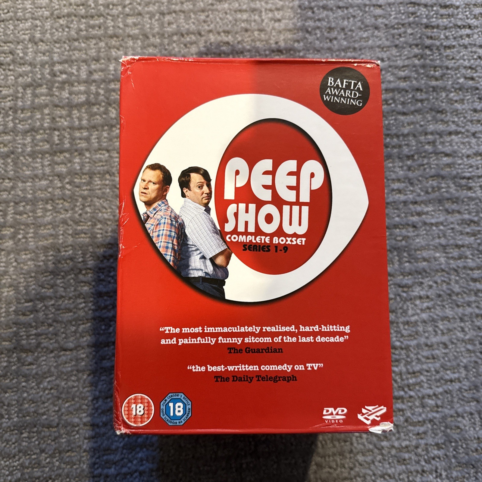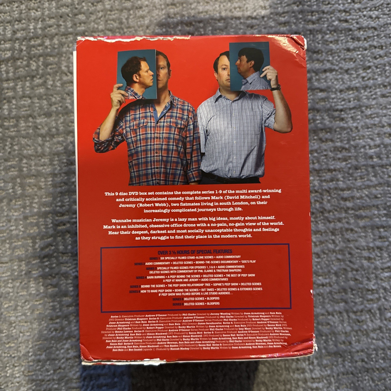 This new unopened 9 DVD box set contains the complete series 1-9 of the BAFTA-award winning and critically acclaimed comedy that follows Mark (David Mitchell) and Jeremy (Robert Webb), two flatmates living in south London, on their increasingly complicated journeys through life. Wannabe musician Jeremy is a lazy man with big ideas, mostly about himself. Mark is an inhibited, obsessive office drone with a no-pain, no-gain view of the world. Hear their deepest, darkest and most socially unacceptable thoughts and feelings as they struggle to find their place in the modern world. PLEASE NOTE THAT WHILE THE DVDS ARE STILL IN THEIR ORIGINAL PACKAGING THERE HAS BEEN SOME DAMAGE AND WEAR TO THE CARDBOARD BOX THAT HOUSES THIS SET. THE DAMGE CAN BE SEEN IN YHE PHOTOGRAPHS. ALSO NOTE THAT THIS IS A UK IMPORT. THE DVDS ARE ALL REGION 2 DISKS. OVER 3 ½ HOURS OF SPECIAL FEATURES - SERIES 1: SPECIALLY FILMED STAND-ALONE SCENES • AUDIO COMMENTARY - SERIES 2: AUDIO COMMENTARY • DELETED SCENES • BEHIND-THE-SCENES DOCUMENTARY • "GOG'S FILM" - SERIES 3: SPECIALLY FILMED SCENES FOR EPISODES 1, 3 & 6 • AUDIO COMMENTARIES DELETED SCENES WITH COMMENTARY BY PHIL CLARKE & TRISTRAM SHAPEERO - SERIES 4: BARN BURNING • A PEEP BEHIND THE SCENES • DELETED SCENES • THE BEST OF PEEP SHOW A PEEP AT MARK AND JEREMY • AUDIO COMMENTARIES - SERIES 5: BEHIND THE SCENES • THE PEEP SHOW RELATIONSHIP TREE • SOPHIE'S PEEP SHOW • DELETED SCENES. - SERIES 6: HOW TO MAKE PEEP SHOW • BEHIND THE SCENES • OUT TAKES • DELETED SCENES & EXTENDED SCENES IF PEEP SHOW WAS FILMED BEFORE A LIVE STUDIO AUDIENCE... - SERIES 8: DELETED SCENES • BLOOPERS - SERIES 9: DELETED SCENES • BLOOPERS