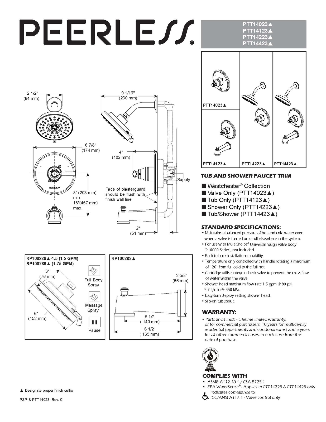 Peerless Westchester Tub & Shower Trim Kit The clean lines of the Westchester collection coupled with hints of a reclaimed look lend a balanced touch to the bath. Design and functionality combine for a rustic & industrial statement without sacrificing function The tub & shower trim kit fits Delta MultiChoice Universal valve rough only (Delta MultiChoice Universal valve rough R10000 sold separately) Includes Delta 13-Series pressure-balance cartridge. This factory refurbished trim kit looks and functions as new and is backed by a 10 year Peerless warranty. DETAILS Polished Chrome Finish Includes Delta 13-Series pressure-balance cartridge Must order Delta MultiChoice Universal valve rough (R10000) separately to complete the unit Spray settings include: Full Body Spray, Massaging Spray, and Pause. Temperature only controlled with handle ADA Compliant PTT14423-R SHIPPING DETAILS We will gladly ship internationally, however, additional shipping and handling fees will apply. Please contact us for shipping quotes. We Gladly Combine Shipping!