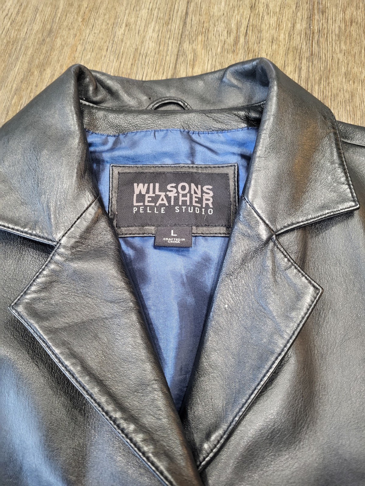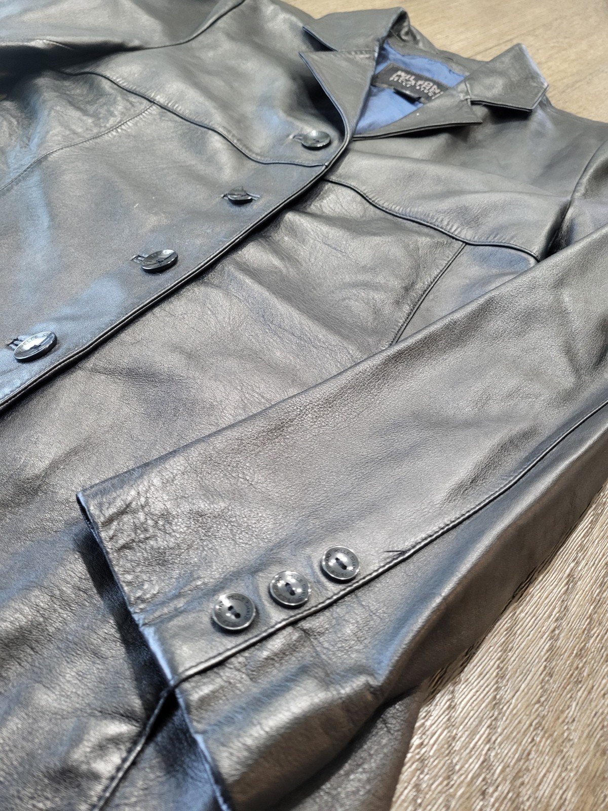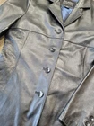 The Pelle Studio Wilsons Leather Jacket in black, size large, is a stylish and versatile addition to any woman's wardrobe. Made from soft leather with a polyester nylon lining, this mid-length jacket features a 4-button closure and a classic pea coat style. Ideal for various occasions such as travel, parties, casual outings, work, and business meetings, this vintage-inspired jacket also offers lined pockets for added functionality. Has one chipped button so selling cheaper. Whether it's for the winter or fall season, this Wilsons Leather jacket is a timeless piece that exudes classic 90s charm.