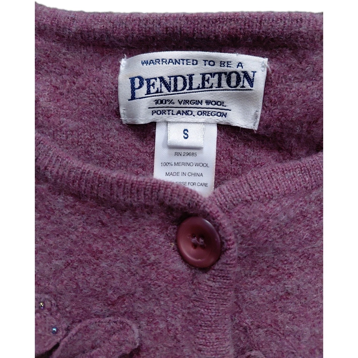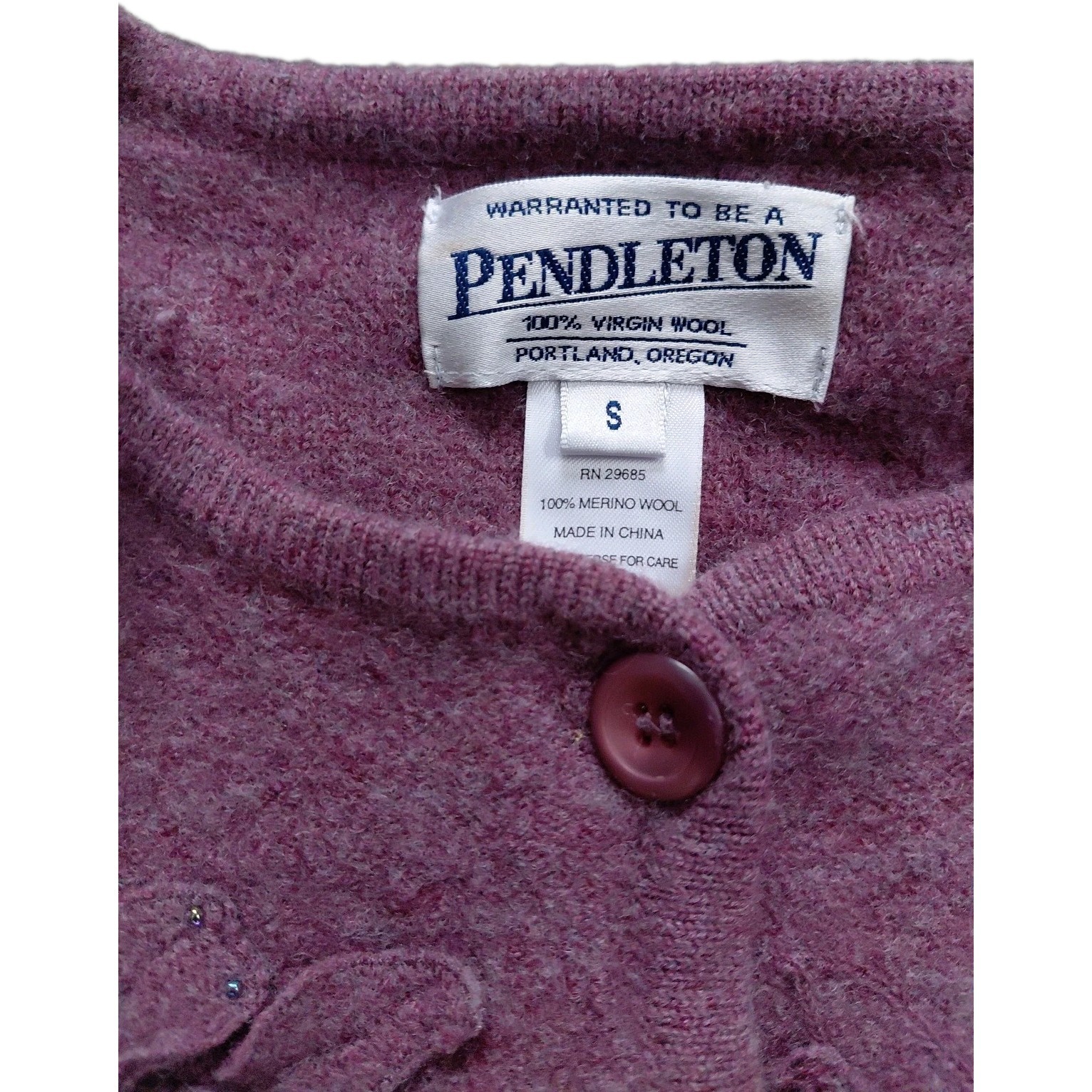 The Pendleton Merino Wool Cardigan is a stylish and sophisticated choice for women in size small. Made from 100% Merino Wool, this long-sleeve sweater features intricate beaded and flower details, perfect for a party or casual occasion. The purple color and nature-inspired theme make it a versatile piece for winter, fall, or spring, while the regular fit ensures comfort and style. Dry clean only to maintain its quality, this cardigan is a classic and timeless addition to any wardrobe.