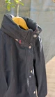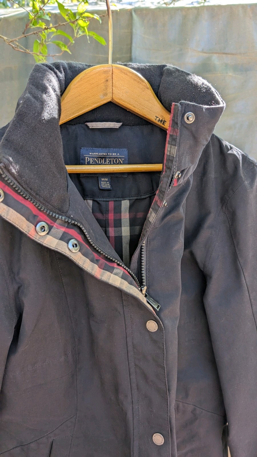 Elevate your outerwear with this Pendleton Misty Falls Anorak Rain Jacket in Black, a stylish and versatile women’s jacket. Crafted from durable cotton with a canvas-like finish, this size Medium piece features a zip and snap closure, a practical hood, and a windproof, waterproof design—perfect for fall, winter, and spring adventures. The polyester plaid lining adds warmth and a touch of classic Pendleton charm, while the regular fit complements both casual outings and business settings. Equipped with functional pockets (including an interior one with the rare 1863 crest seal, a nod to Pendleton’s heritage), this gently pre-owned jacket is ideal for travel or rainy days. In excellent condition, machine-washable, and originally retailed around $200-$250, this timeless piece blends rugged utility with elegant style—don’t miss out!