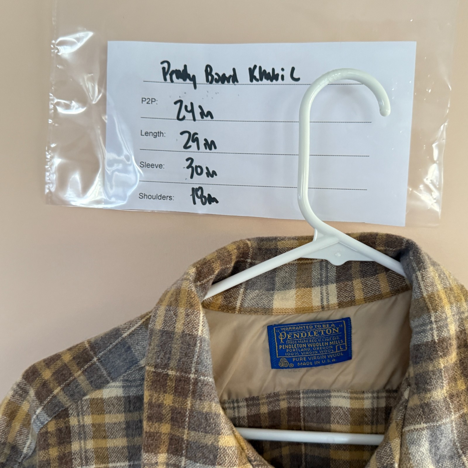 The Pendleton Original Board Shirt in Khaki Plaid is a vintage-inspired button-down shirt made of wool flannel, perfect for casual occasions during the winter, fall, and spring seasons. This collared shirt features long sleeves, a regular fit, and a classic button closure. With its timeless design and quality craftsmanship, this shirt is a versatile wardrobe essential for any man looking for a stylish yet comfortable option for everyday wear.