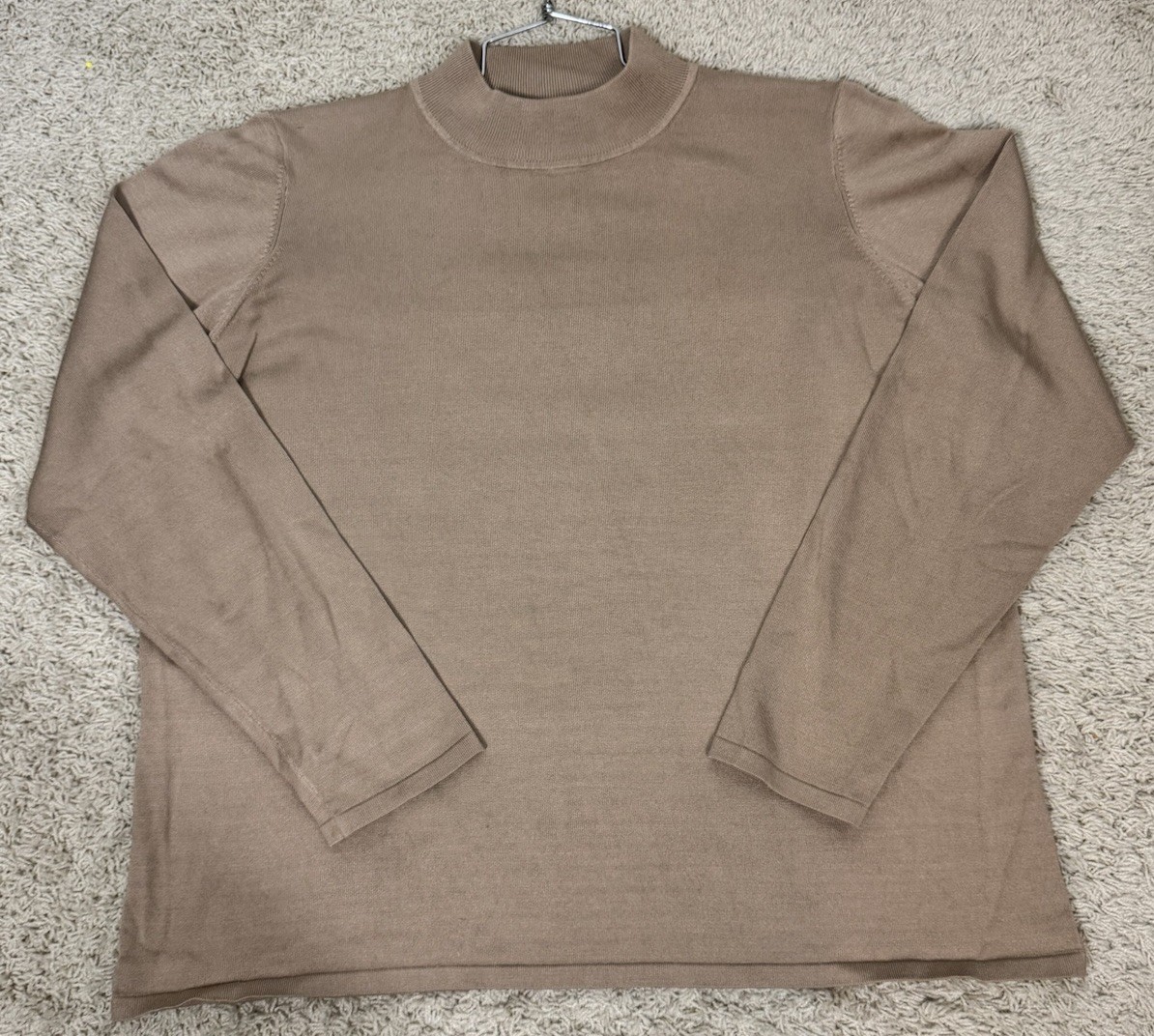 This sweater feels so good…. Excellent condition 75% silk 25% nylon Great as a base layer or nice enough looking to wear alone as a sweater Left sleeve has a tiny snag see pics No other flaws stains or odors Fast ship Bin e