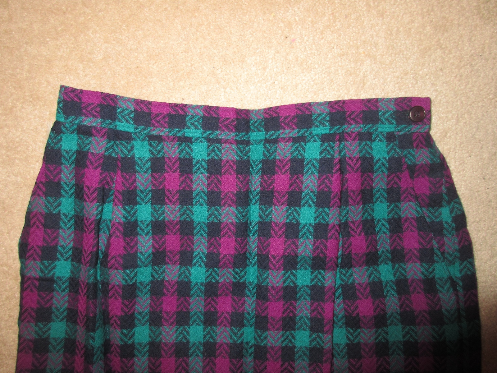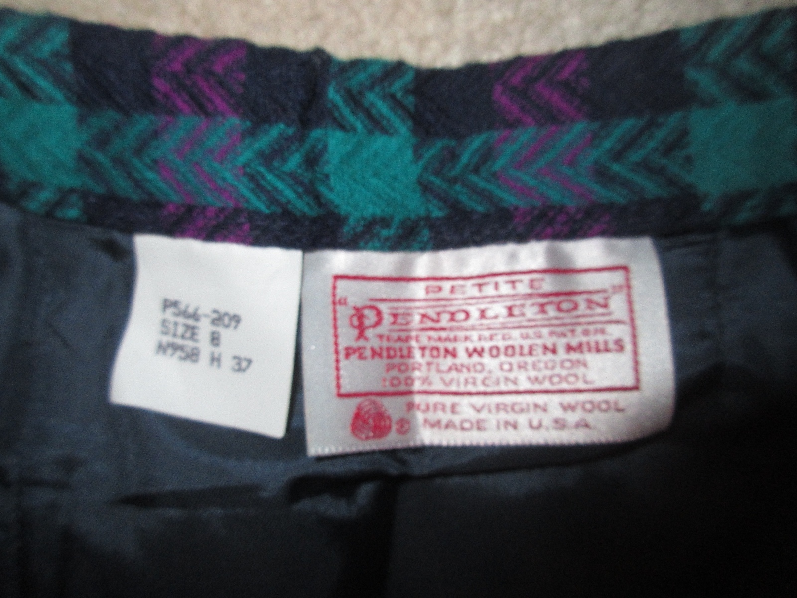WOMEN'S SKIRT DESCRIPTION : BRAND : Pendleton SIZE : Petite 8P Waist: 13.5" (laying flat - unstretched) Length: 23.5" COLOR : Navy, teal green, berry purple plaid DESCRIPTION : Skirt - side button closure - knee length - side pockets - lined MATERIAL : 100% Virgin Wool CONDITION : Excellent used condition. PAYMENT : Payment is due within 3 days of the end of the auction. SHIPPING : Shipping is via US Post Office ONLY. RETURN POLICY : I list items to the best of my ability and try to describe each item as best as possible. Most of the items I sell are purchased at thrift shops/garage sales/etc, therefore I do not know the history to each item. Unless stated new, they are pre-owned items. I cannot guarantee items I sell are from smoke/pet free homes originally. My home is smoke free, however, I do have pets. Because computer monitors and phone screens vary in their ability to display color, color of the actual item may vary slightly. Color is not an acceptable reason for return. Items may be returned for a refund of bid price only (I will not refund any postage). Refunds will be issued once I receive the item back in the same condition as it left. If you have any problems please email me before leaving feedback. Please check out my other items - I will gladly combine shipping! Email me if you have any questions.