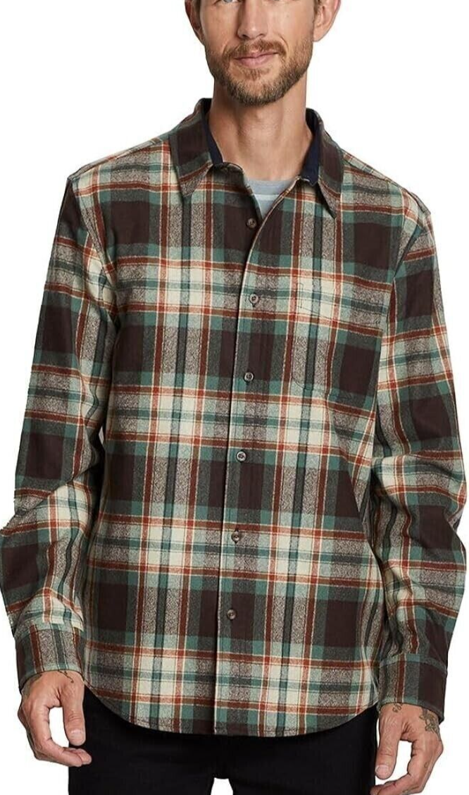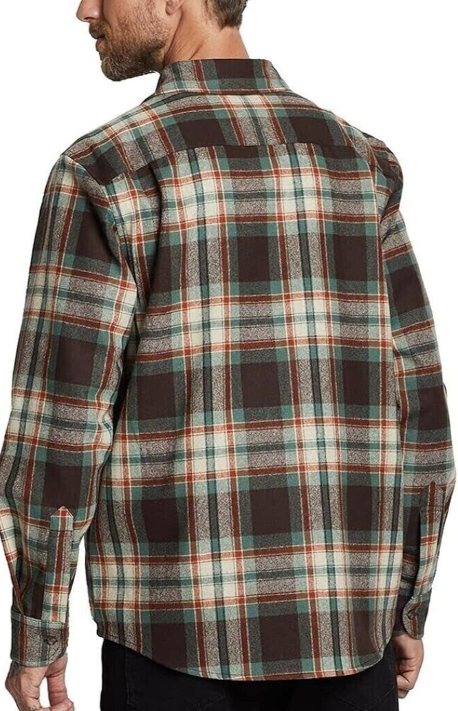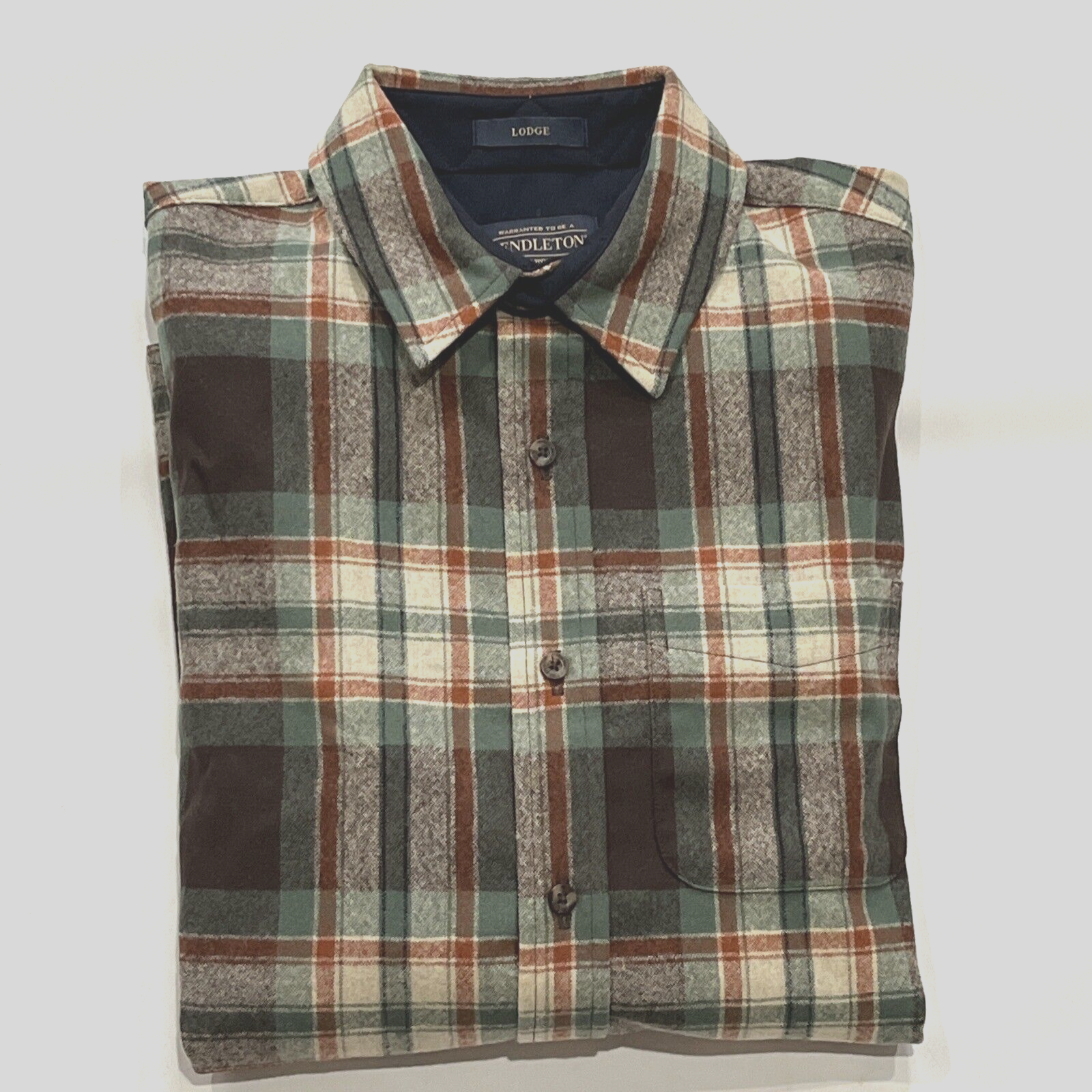 Pendleton men's Lodge full button Wool long sleeve Shirt size: Small color: Brown multi Spread collar Shirttail hem One perfectly matched chest pocket Virgin wool Machine-washable underarm to underarm 21" collar seam to bottom 30" T2544
