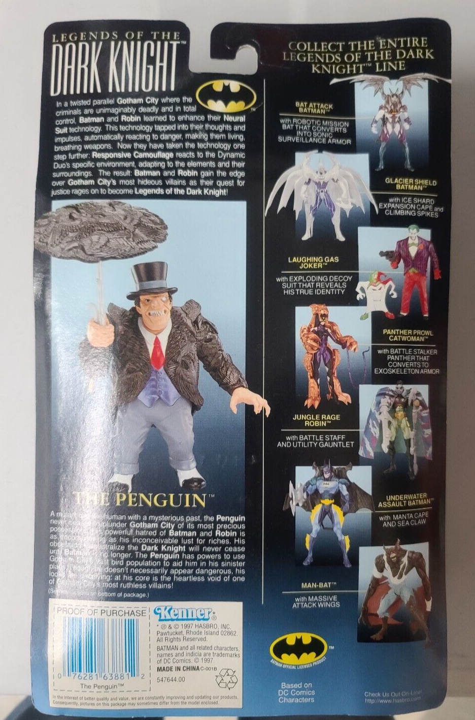 For sale is a brand-new, unopened Kenner Legends of the Dark Knight Premium Collector Series The Penguin action figure from 1996. This collectible features The Penguin, one of Batman's most iconic adversaries, in a detailed and dynamic design. The figure remains factory sealed in its original packaging, ensuring both the item and packaging are in excellent condition. Product Features: Detailed Design: Stands approximately 6 inches tall with multiple points of articulation, allowing for dynamic posing. Accessories: Includes a spinning attack umbrella, adding an interactive element to the figure. Packaging: The original packaging showcases The Penguin in a dynamic pose, highlighting the figure's intricate details and accessories. Collector's Note: Released in 1996 as part of Kenner's Legends of the Dark Knight Premium Collector Series, this figure is a must-have for fans of Batman and action figure collectors. Its detailed craftsmanship and classic design make it a standout addition to any collection. The item will be securely packed with protective materials to ensure it arrives in pristine condition. Don't miss the opportunity to add this classic figure to your collection!