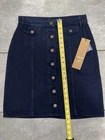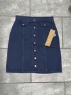 This People Tree skirt is a sleek and stylish piece made of solid blue twill fabric with brass button accents on the front. Designed in a straight and pencil style, it features pockets for added convenience. The skirt is knee-length and size 4 (UK size 8), suitable for a regular fit. With a combination of nature, art, American, nautical, city, 90s, and preppy themes, this piece exudes a versatile and trendy aesthetic perfect for various occasions.