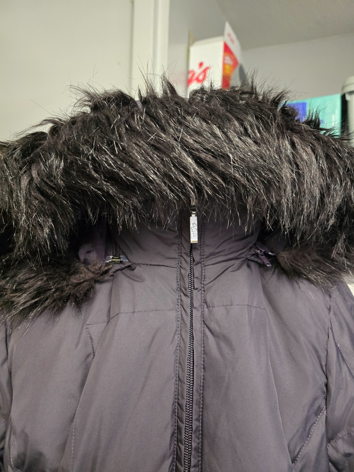 PER UNA FEATHER/DOWN MID LENGTH COAT HOODED WITH BLACK FAUX FUR TRIM IN AUBERGINE ZIP POCKETS SIZE L PIT-PIT 23" LENGTH 25" LOVELY & WARM IDEAL FOR WINTER NICE CONDITION
