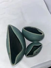 This elegant set of three modernist ceramic vases features a striking mid-century aesthetic with clean lines and organic shapes. Crafted from a matte green glazed ceramic, these vases offer a minimalist yet artistic design. Perfect as a statement centerpiece or as a collectible item for art pottery enthusiasts. Each vase has unique openings, making them suitable for single stems or as sculptural decor pieces. The set is in excellent vintage condition, showcasing subtle variations in glaze and form that highlight their handmade quality. Details: Category: Home & Living > Home Decor > Vases Style: Mid-Century Modern, Modernist Estimated Year of Manufacture: 1950s–1960s Material: Ceramic Color: Matte green Dimensions: Large vase: Approximately [provide height/width measurements] Medium vase: Approximately [provide height/width measurements] Small vase: Approximately [provide height/width measurements] Weight: [provide total weight in ounces] Condition: Excellent vintage condition with no chips or cracks.