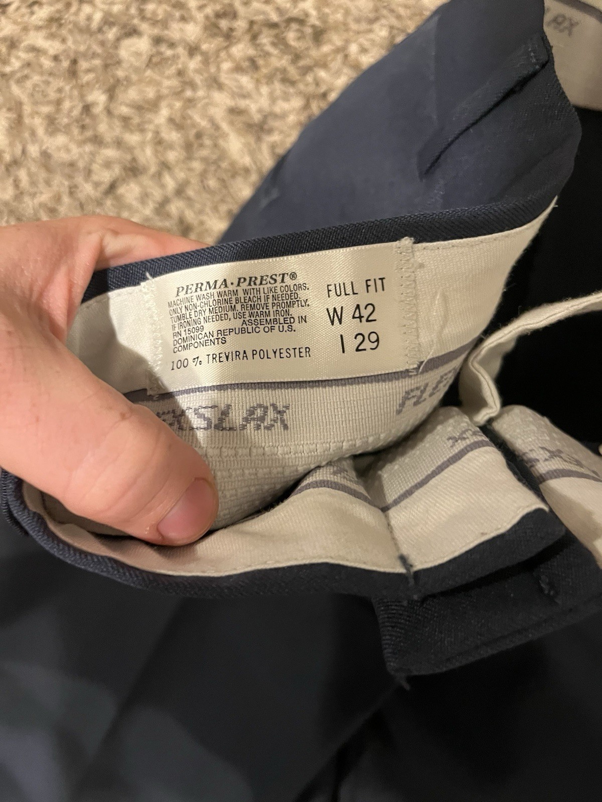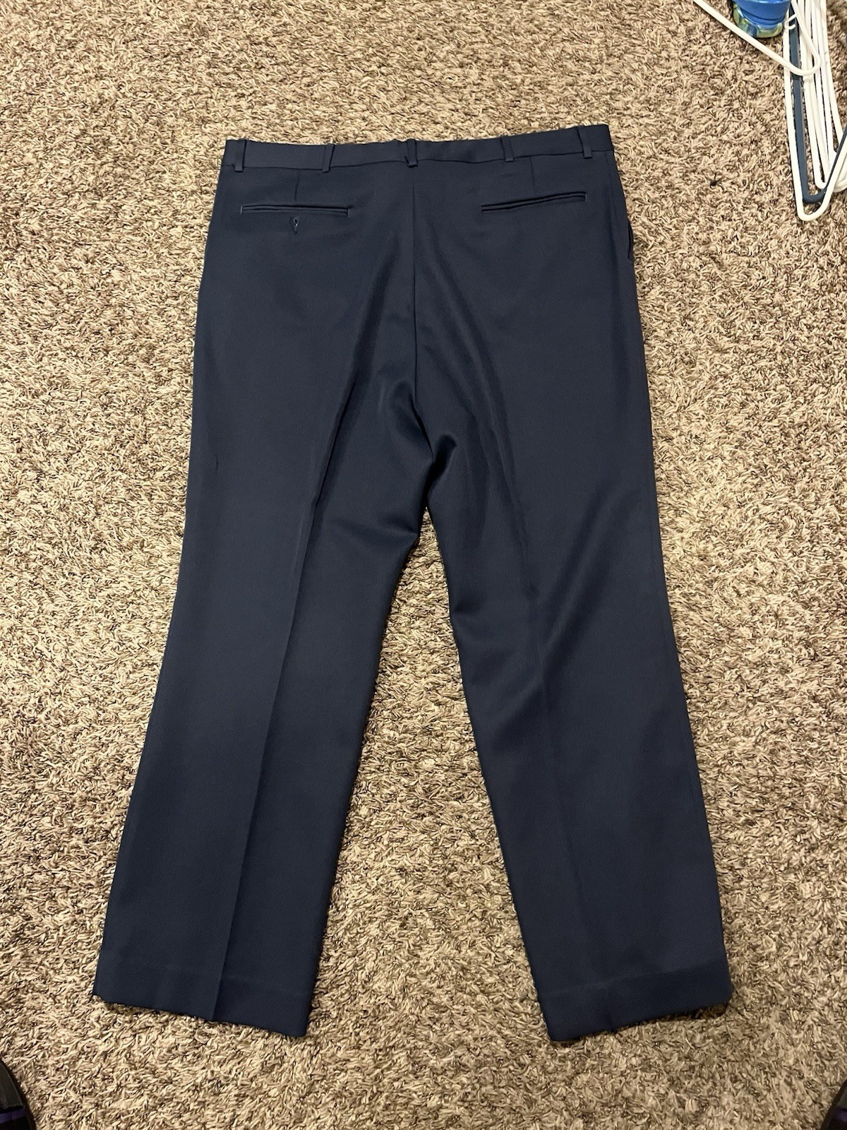 These slacks are a fantastic find! The navy blue color is rich and professional, and the perma-prest fabric keeps them looking crisp with minimal effort. The fit is true to size—comfortable with just the right amount of stretch. Even though they're pre-owned, they're in excellent condition, like new. USPS shipping was quick and hassle-free. A great value for high-quality dress pants!