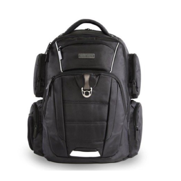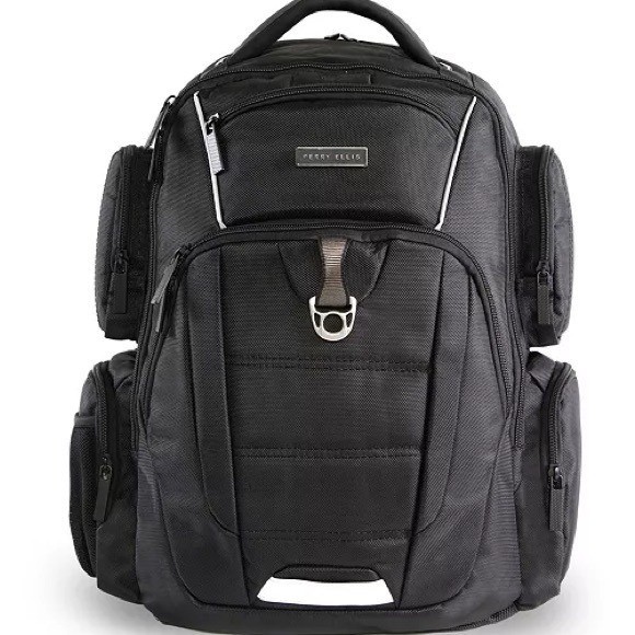 The Perry Ellis Business Laptop Backpack is perfect for going to work or on any business trip. The padded laptop compartment can fit most 15" laptops. Multiple compartments and pockets provide plenty of storage space for documents, chargers, mouse, keys, business cards, and pens. Airport travel is made even easier with a luggage strap located on the back of the backpack. Product Features 15"W x 10"L x 18"H Weight 3.5lbs. 2-year manufacturer's limited warranty Polyester Spot Clean Imported