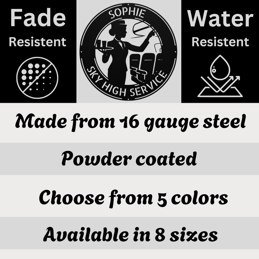 Product Description Celebrate the dedication and spirit of flight with this Personalized Flight Attendant Metal Art Sign . Designed for flight attendants, airline professionals, and aviation enthusiasts, this unique metal piece adds charm, personality, and style to offices, lounges, or home spaces. β¨ Expert Craftsmanship Each sign is laser-cut from premium 16-gauge steel and finished with a durable powder coat to protect against rust, fading, and scratches. Whether displayed indoors or in covered areas, your artwork will maintain its bold, polished appearance for years. πΏ Key Features: Fully Personalized: Add your name, airline, or custom message Premium Steel: Sturdy and long-lasting construction Aviation-Inspired Design: Perfect for offices, flight lounges, or home dΓ©cor Multiple Sizes: 8ββ30β, with custom sizing available Easy to Hang: Pre-drilled holes for quick mounting Color Options: Black, gold, silver, or white finishes π Perfect Gift for Flight Attendants A thoughtful and memorable gift for airline professionals, birthdays, graduations, or holidays. π Celebrate Your Career in Aviation Add charm, style, and a personalized touch to any wall with this Custom Flight Attendant Metal Art Sign , a standout dΓ©cor piece for aviation lovers. Service and Color Choice My metal signs are designed to be personalized just for you, making them the perfect addition to any space! The default color is Black , but I also offer a variety of beautiful options including Copper, Gold, White, and Silver . After placing your order, simply contact me with your preferred color choice, and I'll ensure your sign is exactly how you envision it. Letβs create something special together! π How Metal Signs Are Measured Metal signs are measured from the widest point to the opposite widest point of the design. The listed size (8β, 10β, 12β, 18β, 24β, 30β, 36β, etc.) always refers to the longest edge of the artwork, not the height only and not the width only. Because every design has its own shape and proportions, the other dimension (height or width) will adjust automatically . π Example (30-Inch Size) When selecting a 30-inch sign , the longest side of the design will measure 30 inches . If the design is wider than it is tall: Width = 30 inches Height adjusts proportionally (often around 18β22 inches depending on the design) If the design is taller than it is wide: Height = 30 inches Width adjusts proportionally This ensures the sign keeps its correct proportions and the original shape, no matter which size is selected. π¨ Custom Designs & Logos Welcome Have a special idea in mind? I can make it happen! Whether you need a business logo , family emblem , pet silhouette , or a one-of-a-kind design , I can create it from scratch and turn it into a high-quality metal sign. You can send your concept, sketch, or photo, and Iβll handle the custom design, editing, and production from start to finish. Your vision becomes real metal artwork made exactly the way you want it. β¨ Custom Any Design: If you have a special idea in mind, I can turn it into a metal sign, just message me! π¦ Ordering & Gift-Ready Each sign is crafted to order with great care and attention to detail. Your piece arrives ready to hang , making it easy to display or give as a thoughtful gift. Whether it's for your home or for someone special, every sign is made to impress and last for years. π Your support means the world to me and my family. Thank you for helping keep this small art business growing. π Production & Shipping Every sign is made to order with a fast turnaround time. Production Time: 1β2 business days Free Shipping: UPS Ground (estimated 2β5 business days ) Expedited Shipping: FedEx 2-Day Delivery available at checkout Shipping Location: All orders ship from Indiana, USA Each order is packed securely to ensure your metal sign arrives safely and ready to display.
