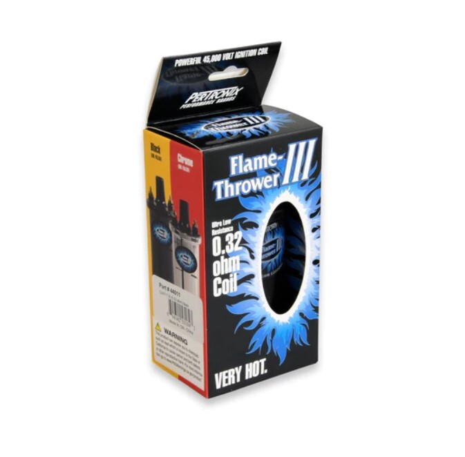 PERTRONIX FLAME-THROWER III COIL 45,000 VOLT 0.32 OHM BLACK Part Number: 44011 FLAME-THROWER III COIL. 45,000-VOLT RATED WITH 0.32-OHMS OF RESISTANCE. THIS COIL IS SPECIFICALLY ENGINEERED FOR IGNITOR III APPLICATIONS. BLACK OIL FILLED CANISTER STYLE. Ignition Coil Model Or Series: Flame-Thrower III Coil Type: Canister Maximum Voltage: 45,000 Volts Primary Resistance: .32 Ohms Secondary Resistance: 7.0k Ohms Coil Wire Attachment: Points (Socket) Height: 6.000" Diameter: 2.150" Finish: Black Internal Construction: Oil Filled Primary Inductance: 2.5 mH Turns Ratio: 110:1 Includes Mounting Bracket: No Includes Ballast Resistor: No Includes Hardware: No Quantity: Sold As Each The Flame-Thrower canister style coil has been engineered to complement our Ignitor Electronic Ignition Conversion Kits and Plug n’ Play Distributors. Choose from the Flame-Thrower, Flame-Thrower II, and the Flame-Thrower III depending upon system voltage and resistance. Oil filled coils offer great heat control for street driven vehicles, while epoxy filled coils provide superior winding support for high vibration environments in off-road vehicles and boats. 45,000 volts. Ultra Low 0.32 primary resistance. Compatible with Ignitor II and III systems as well as most capacitive discharge systems. Charges to peak current typically 30-70% faster than other coils. Rapid charge time means maximum spark energy is sustained to higher engine RPM. Flame Thrower III coils feature an ultra low resistance and are designed specifically for the Ignitor III Electronic Ignition Conversion kits. They feature a high turn ratio and ultra-low primary resistance enabling the ignition system to charge faster at high RPM's.