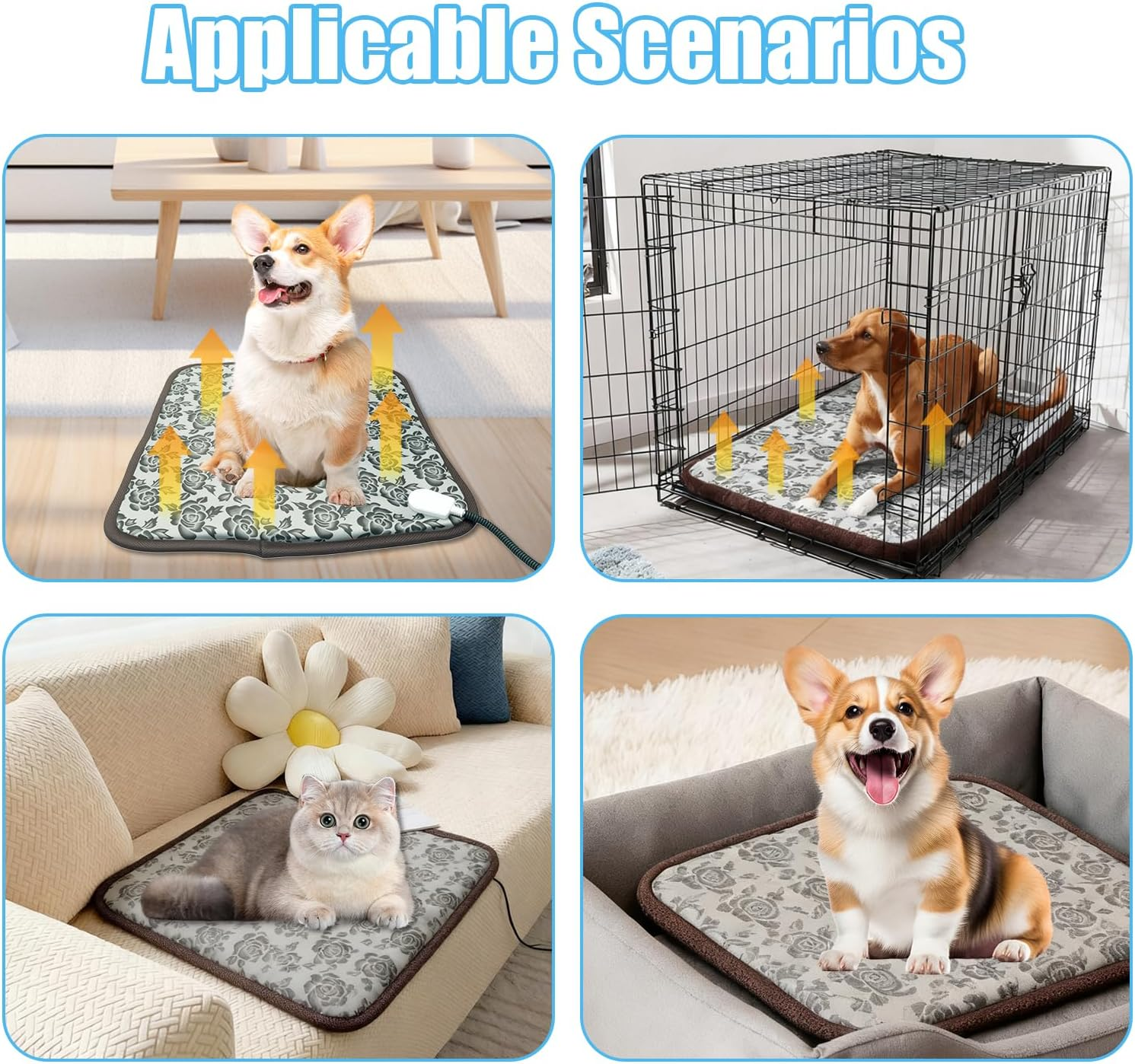 Anti-chew Power Cord: The anti-chew power cord safeguards against pet chewing, preventing potential electrical hazards. 3-setting Switch: Simple to operate with a 3-setting switch: high temperature (113°F), low temperature (95°F), and off. Waterproof: Crafted from high-quality, waterproof leather material (avoid prolonged exposure to rain), it’s durable and easy to clean with just a damp cloth—no need for soaking. 17.7x17.7 Inches: Sized at 17.7x17.7 inches, this heating pad is ideal for small dogs and cats. *Note: Keep the pad flat during use and avoid folding it. Keep Warm: Offers warmth and comfort to pets in cold weather, ideal for warming newborns, pregnant pets, and relieving joint pain in older or arthritic animals. Product description