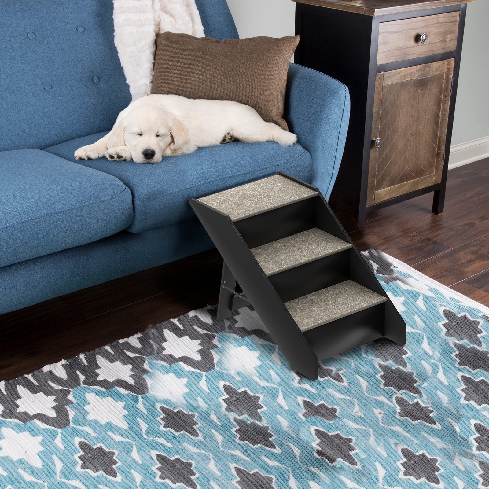 3 STEP DOG STAIRS - The 3-step design gives the perfect boost for pets that need it, and is good for small puppies, kittens, or for older dogs and cats that need a little extra help to get up to their favorite resting spot. CARPETED - The stairs are carpeted to provide added comfort and safety for your pet, as the texture helps to prevent paws from slipping off. The neutral coloring of the pet steps will complement any décor. TRAVEL FRIENDLY - The compact and foldable design makes this convenient pet accessory a travel friendly option. The space saving design makes it easy to stow the dog stairs for large dogs in a closet, car, or under the bed. STURDY CONSTRUCTION - Made from durable wood and MDF, this sturdy set of pet stairs can support pets up to 80lbs and is made to last. Your furry friend will love these easy-to-use doggie steps for years to come. PRODUCT DETAILS - Materials: Wood and MDF. Dimensions: (L) 30” x (W) 15” x (H) 16.5”. Weight Capacity: 80lbs. No assembly required. The dog ramp for beds is not designed to hold people. Color: Gray.
