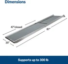 About this item ADVENTURE READY: Embark on worry-free adventures with your furry friend using the ramp for dogs to get in your car. This PetSafe Happy Ride Extra Long Telescoping Dog Ramp is the perfect car ramp for dogs, eliminating strain and discomfort. ADJUSTABLE LENGTH: Adjustability is a key feature of this telescoping pet ramp, with a length that extends from 47 to 87 inches. ramp measures 47"-87" in L X 20" in W X 4" in H. Providing ample space for your pet, this ramp is especially beneficial for larger dogs navigating taller vehicles. DURABLE & SAFE: Built with durability and safety at its core, this ramp is independently tested and rated to support pets up to 300 lb. This robust design provides a secure platform for your pet, giving you peace of mind that they can safely use the ramp without risk of injury. LIGHTWEIGHT: Despite its robust construction, this dog ramp for large dogs is surprisingly lightweight at just 18 pounds. Easy to transport, these ramps for dogs ensure you can always have it on hand for your travels. ANTI-SLIP: Featuring a high-traction surface and side rails, these dog steps for trucks are designed to prevent your pet from slipping or falling. This added security of dog steps for cars give you peace of mind, knowing your pet can safely use the ramp in all weather conditions. SIMPLE TO STORE: Ramp easily slides inward and locks with the safety latch to let you conveniently store it in your vehicle Brand PetSafe Material Aluminum Color Gray Item Weight 18 Pounds Product Dimensions 87"L x 20"W x 4"H