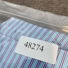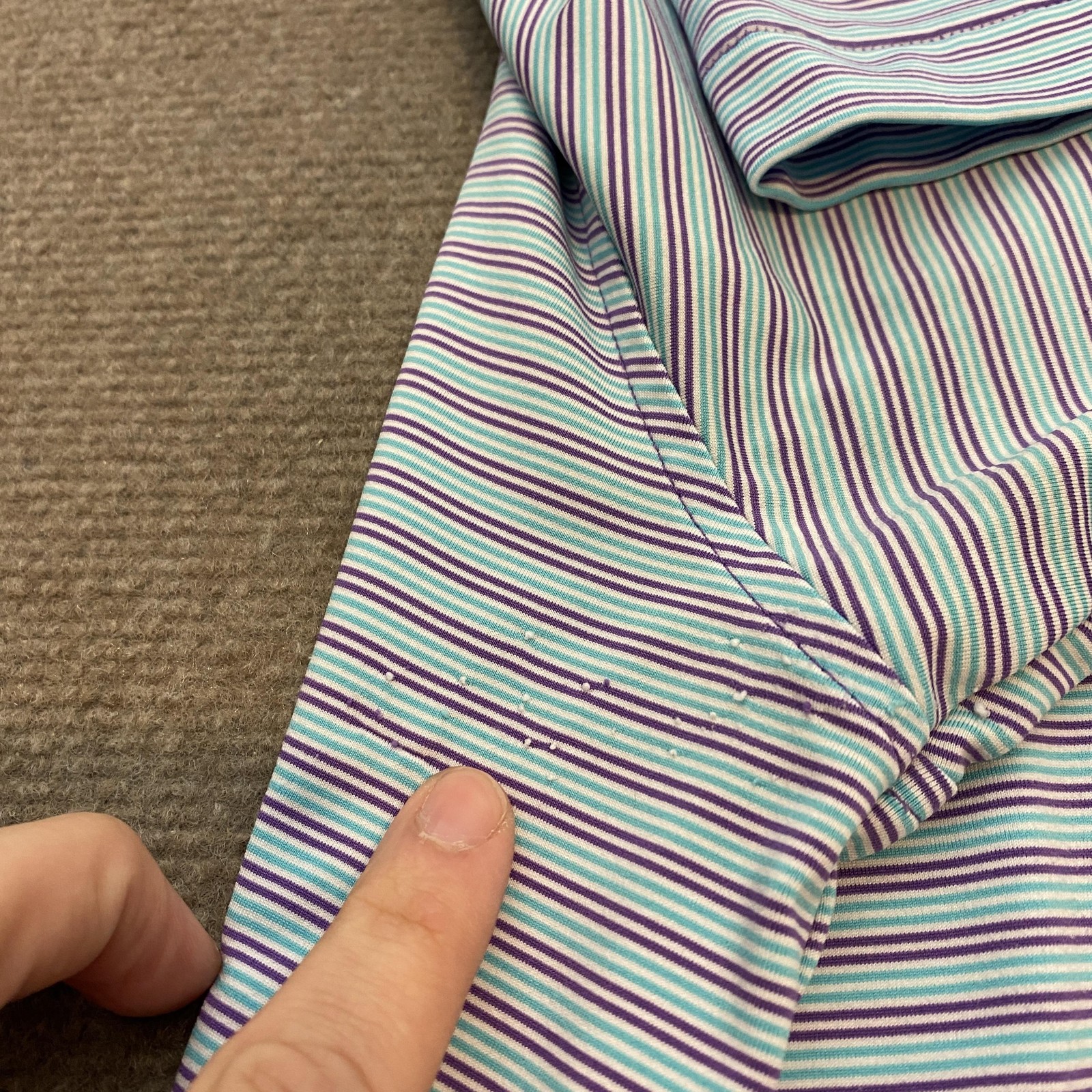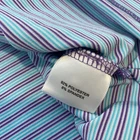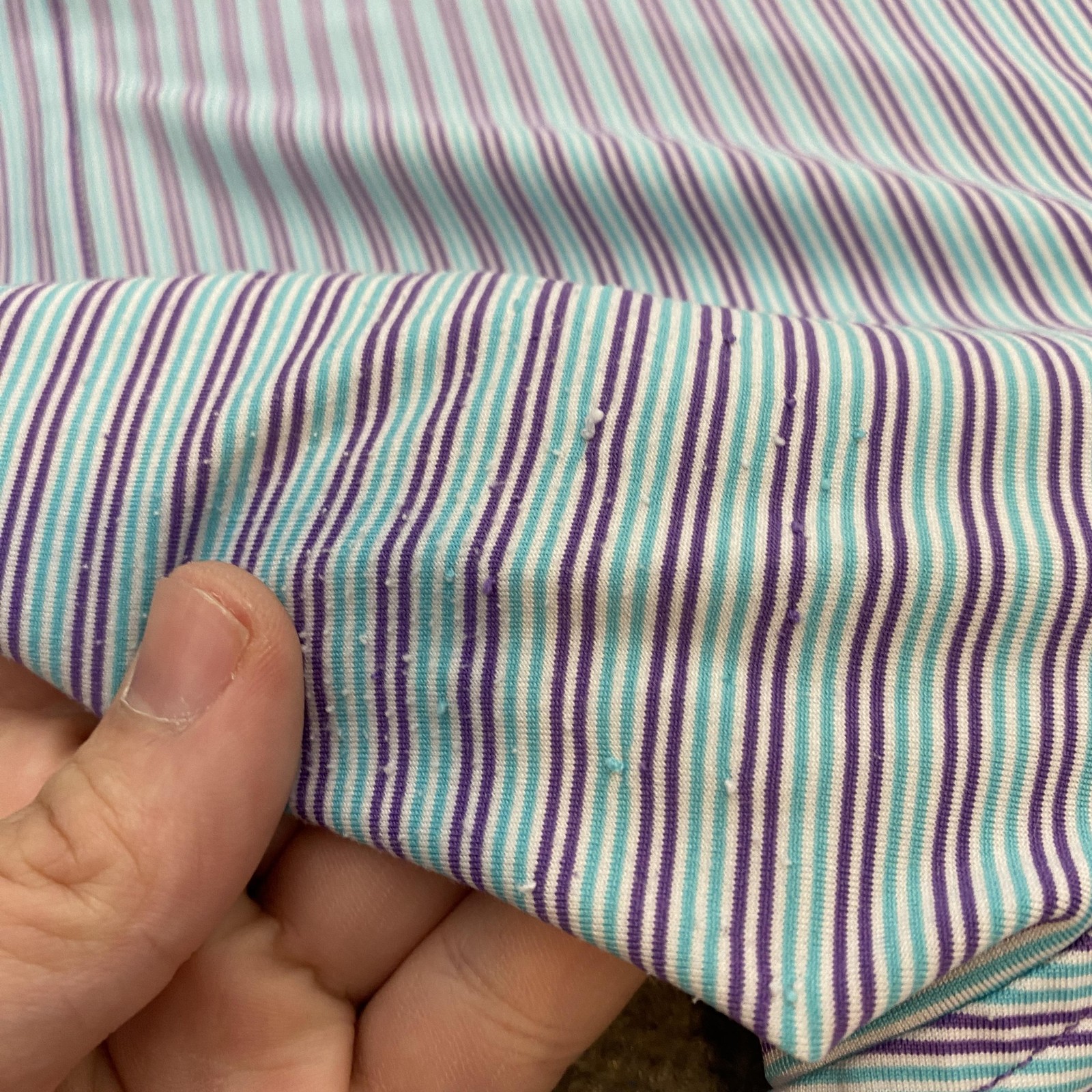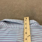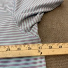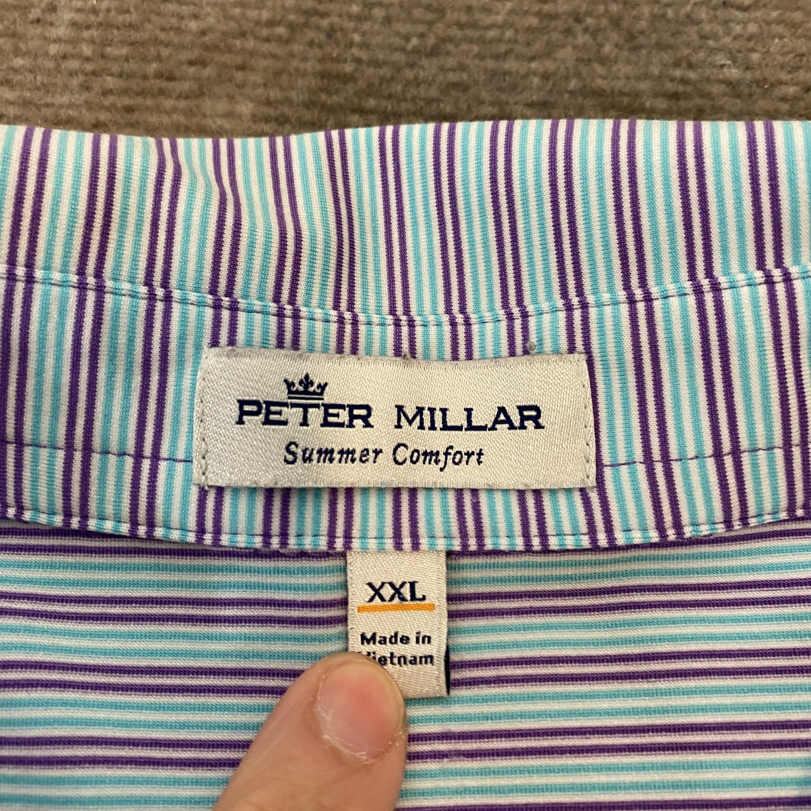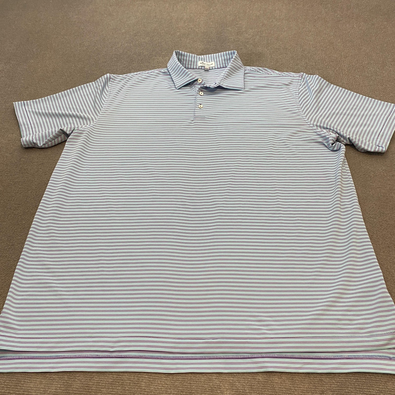 Previously worn with scattered small fabric snags and light pilling on front and near side/underarm areas, shown in photos. Fabric is clean and intact with no stains or holes. Buttons, collar, and seams are secure and shirt remains very wearable. Brand: Peter Millar Style: Summer Comfort mens short sleeve golf polo shirt with classic knit collar and three-button placket. Color: Blue base with aqua, white, and purple horizontal micro stripe pattern. Size: Mens 2XL (XXL tag size), regular fit. Material: 92% polyester, 8% spandex lightweight stretch jersey; made in Vietnam. Details: Collared neckline, short sleeves, straight hem with side vents, three-button front placket, soft performance fabric with comfortable stretch, and clean front with no chest logo embroidery for a versatile look on or off the course. Note: Fabric shows scattered small snags and light pilling from wear; see photos for close-up views.