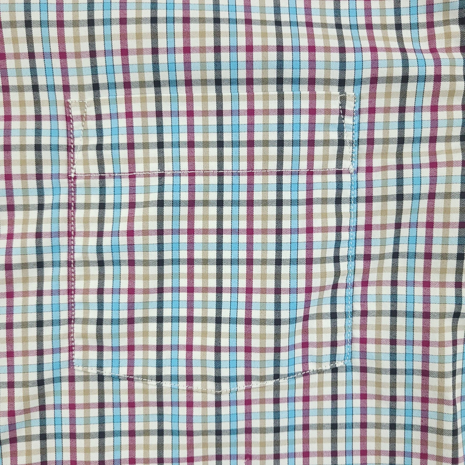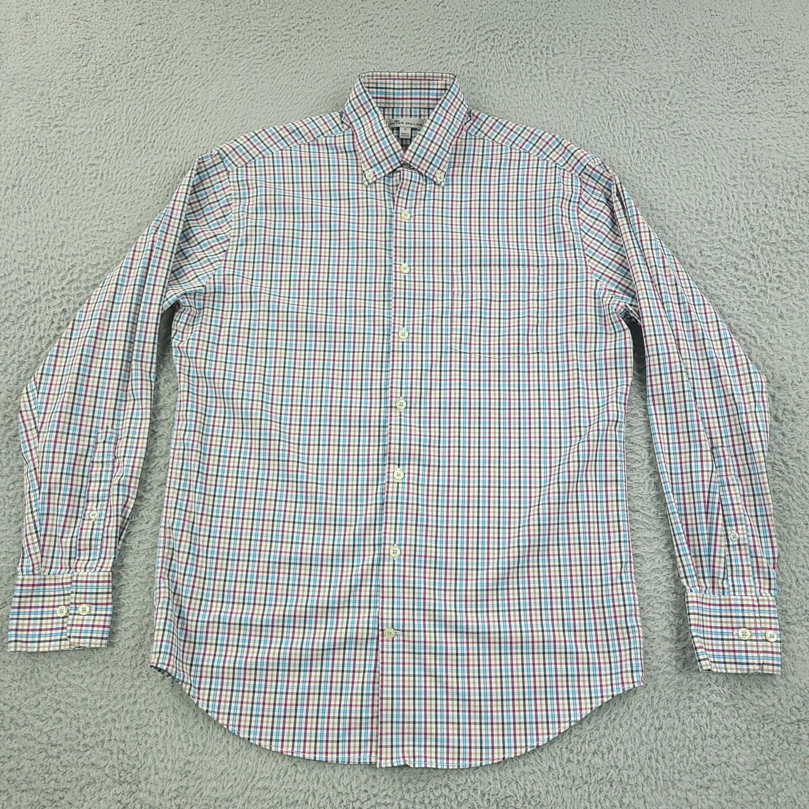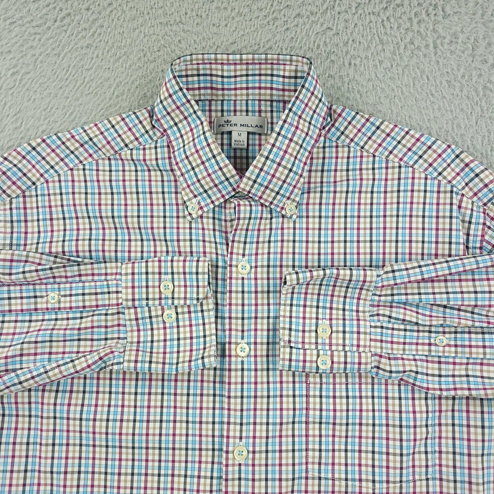 Brand: Peter Millar Style: Mens long-sleeve button down shirt with a multicolor plaid pattern and button-down collar. Color: Multicolor check including shades of blue, burgundy, tan, and white. Size on tag: Medium (M) Materials: 94% nylon, 6% spandex for lightweight stretch performance comfort. Details: Front button closure, single chest pocket, adjustable button cuffs, curved hem, performance woven fabric suitable for golf, office, or casual wear. Made in Vietnam. Washed and dried with Fragrance Free Detergent & Dryer Sheets. Measurements are included in the photos, compare measurements with your item to ensure proper fit. (Measurements are done with the item lying flat). I ship next business day and all items include tracking. Items are added daily to my store Visit My Store Buy More & Save! Combined shipping for US customers - $1.99 for each additional item (Add items to shopping cart and discounts will automatically calculate during checkout)