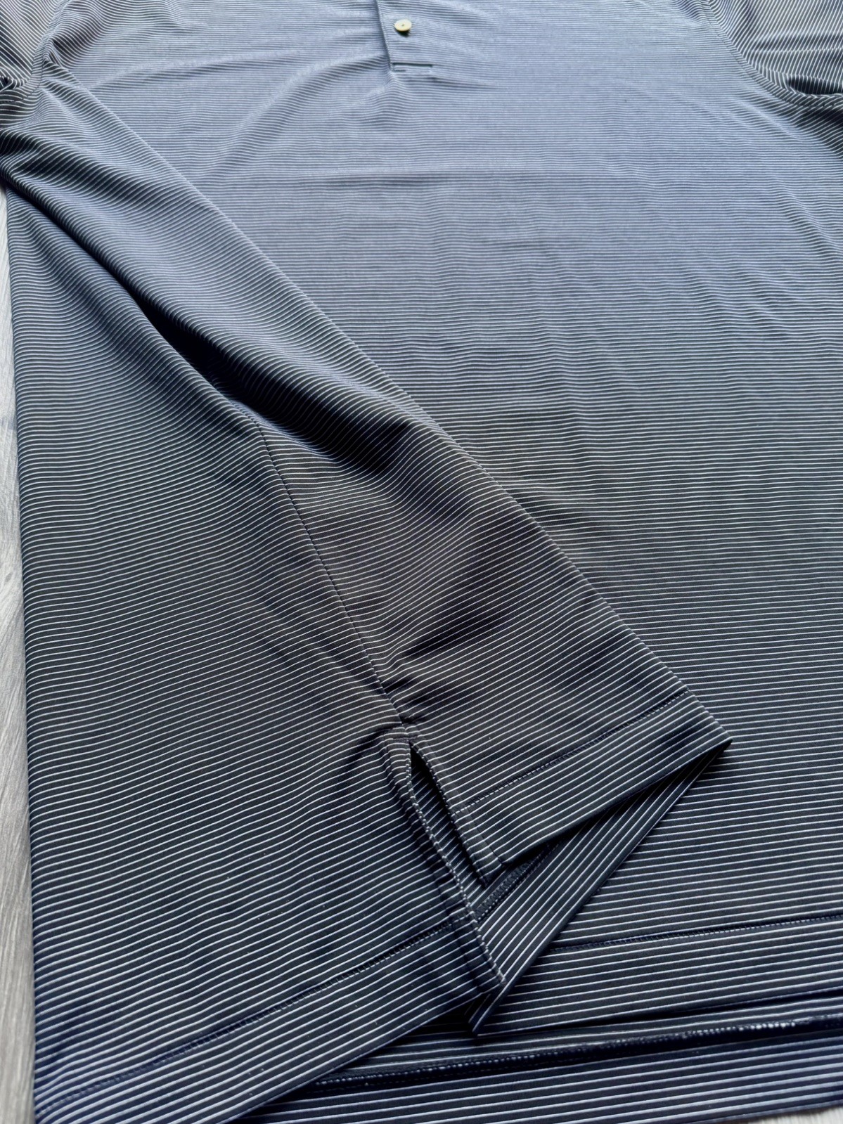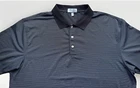 The Peter Millar Men's XL Black Summer Comfort Performance Golf Polo in Stretch is a stylish and versatile shirt perfect for both activewear and casual occasions. Made from a blended fabric with a touch of polyester for added stretch and comfort, this polo features a collared neckline, button closure, and a spread collar style. The classic black color and striped pattern make it suitable for all seasons, while the logo accents add a sporty touch. Easy to care for and machine washable, this polo is designed for the modern man who values both style and performance in their wardrobe.