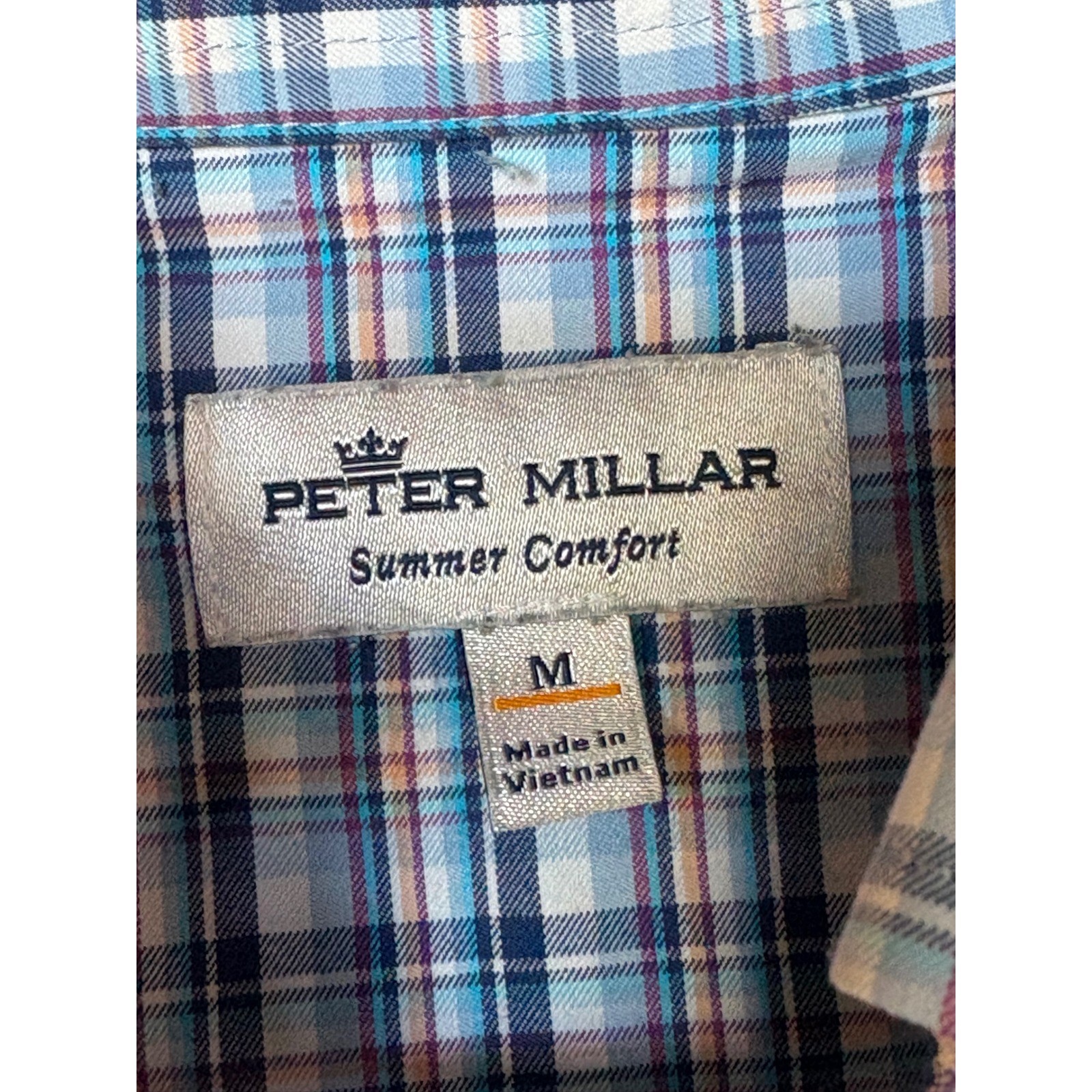 A Peter Millar Summer Comfort button-down shirt. This stylish garment showcases a classic plaid pattern in shades of blue and white, accented with subtle hints of green and purple. Crafted for breathability and ease of movement, it features a button-down collar and a chest pocket for a polished look. Its lightweight construction makes it ideal for warm-weather outings, such as a casual weekend brunch or a relaxed outdoor gathering. Sleeve Length: Long Sleeve Department: Men Closure: Button Accents: Button Pattern: Plaid Theme: Designer, Business Casual, Golf, Travel Material: Nylon, Spandex, Nylon Blend Features: Lightweight, Stretch, Breathable Fabric, Wrinkle Resistant Collar Style: Button-Down Neckline: Collared Type: Button-Up Pit-to-Pit: approximately 22" Length: approximately 29" Keywords: Peter Millar, Summer Comfort, mens button down shirt, plaid shirt, long sleeve shirt, medium size, nylon spandex, breathable fabric, lightweight shirt, casual shirt, dress shirt, menswear, smart casual, golf shirt, travel shirt
