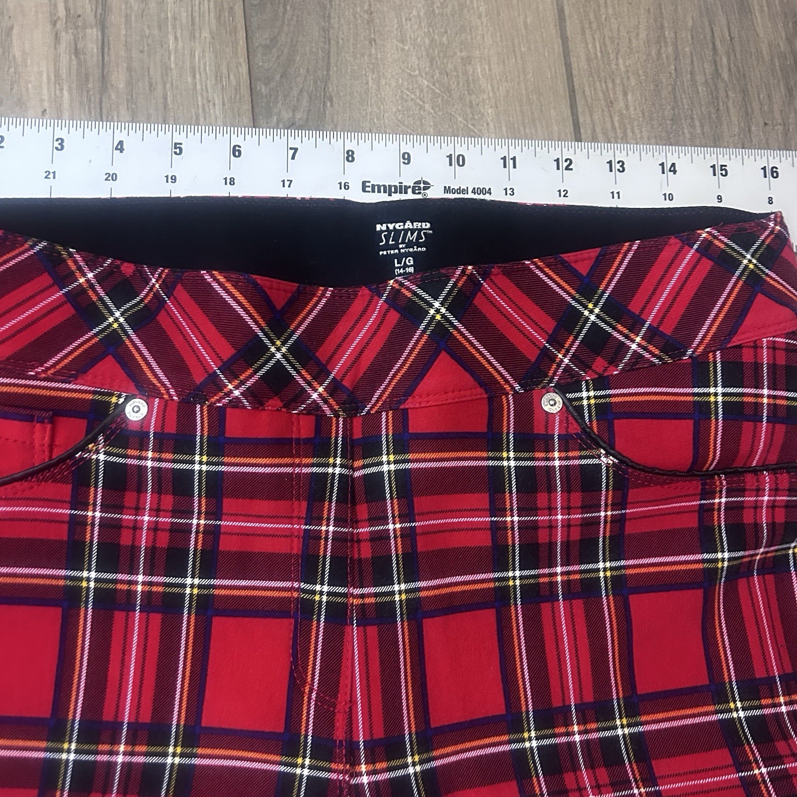 Make a bold statement with these Peter Nygard red tartan plaid pants, a standout piece that blends classic heritage style with modern comfort. Designed with a flattering high-rise pull-on waistband and a sleek, tailored leg, these pants are both eye-catching and wearable.