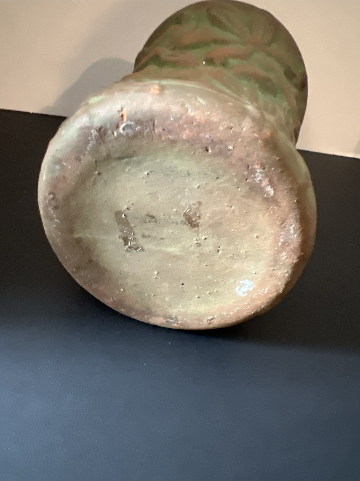 The PETERS & REED MOSS AZTEC ARTS & CRAFTS CLEMATIS FLOWER VASE is an antique piece of decorative pottery featuring a unique Aztec pattern and multicolor design. Handmade in the Arts & Crafts/Mission style, this original vase showcases intricate details and a matte finish. With its artistic theme and production technique of pottery, this piece is sure to add a touch of elegance to any space. Item is 6 inches tall. Located in Lisa’s room.