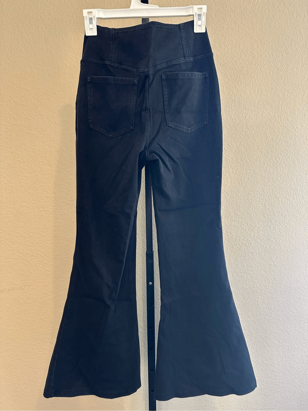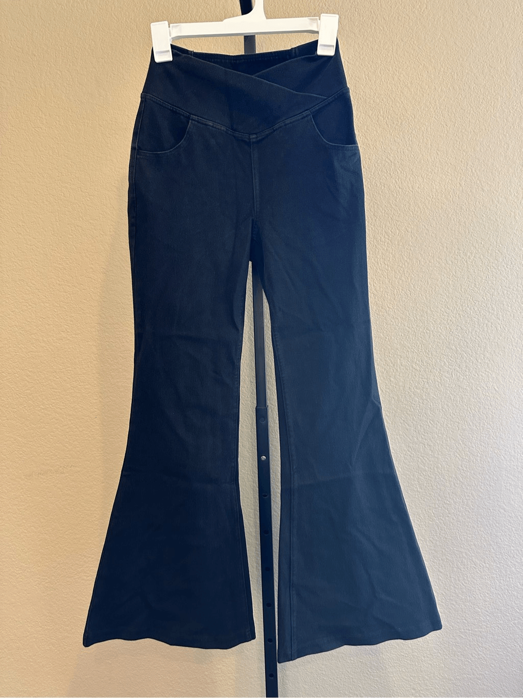 Size S (Petite) Halara High Waisted Crossover Pocket Washed Stretchy Knit Super Flare Jeans in Black Denim Tag attached Dust noted Recommend washing prior to wearing Hugh waist Crossover waistline Flare Multiple pockets Denim Stretchy fabric Halara size guide and fabric contents shown in the images The original package may show signs of handling. There should be no stains or damage to the garment unless otherwise noted. Garment may show signs of being tried-on.