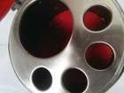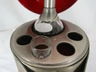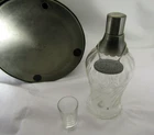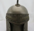 This is a rare vintage Pewtertone Liquor Bottle and Shot Glass Holder. The shape is an Medieval Helmet. It is made of Pewter. It is about 8 1/4 inches long by 8 1/4 inches wide by 12 inches tall. Open the helmet and find a place for a bottle and 4 shot glasses. 3 of the shot glasses are missing. The bottle has a tag that read GIN on one side and SCOTCH on the other side. The bottle can use a good cleaning. The outside of the helmet has a lot of patina and can use a good cleaning. The helmet has some scratches and or marks. The interior is red. There is something loose inside the bottom. It is missing 2 of the 4 plugs. It is marked on the bottom PEWTERTONE OLDE TANKARDWARE REG. U.S. PATENT OFFICE SEYMOUR ****** MADE IN JAPAN. This would look great in any bar room. B067-2000/2000-T126070X2