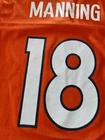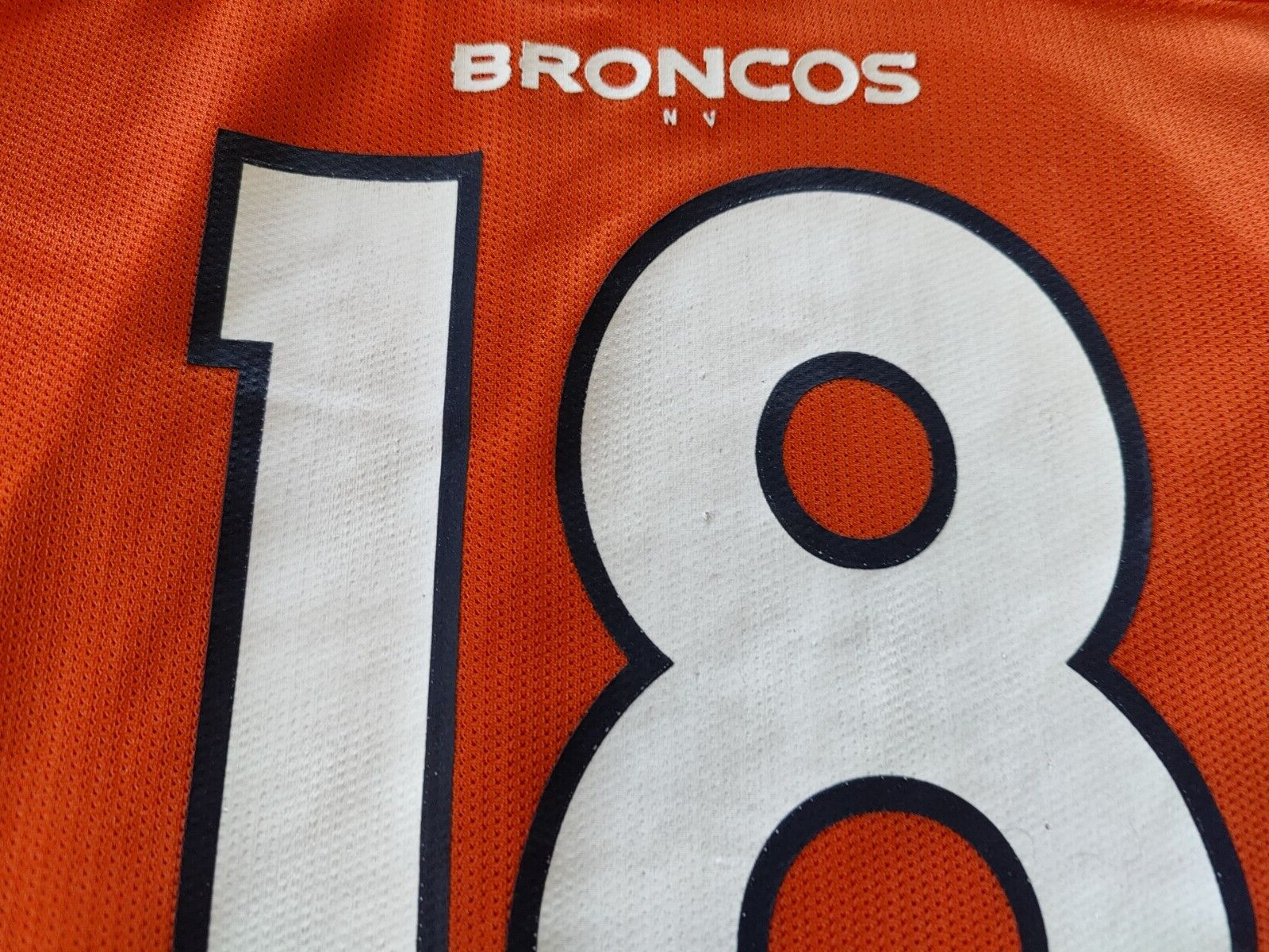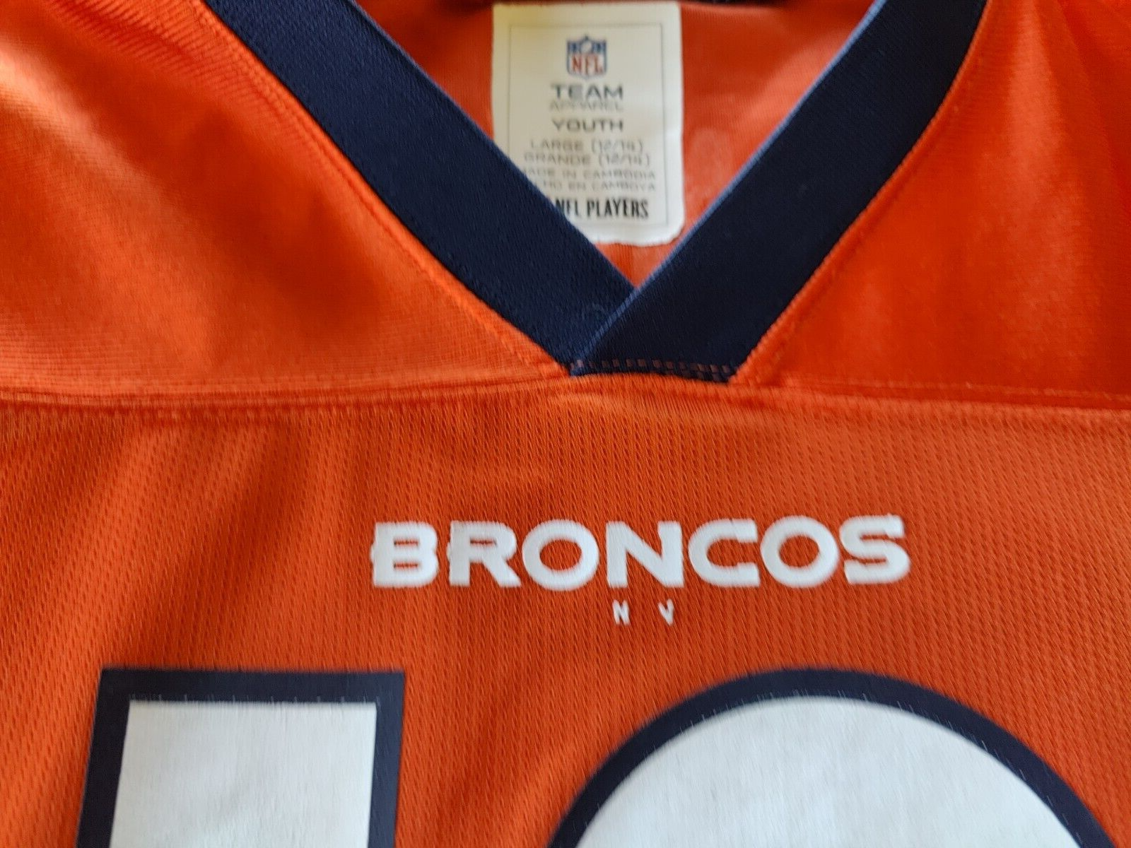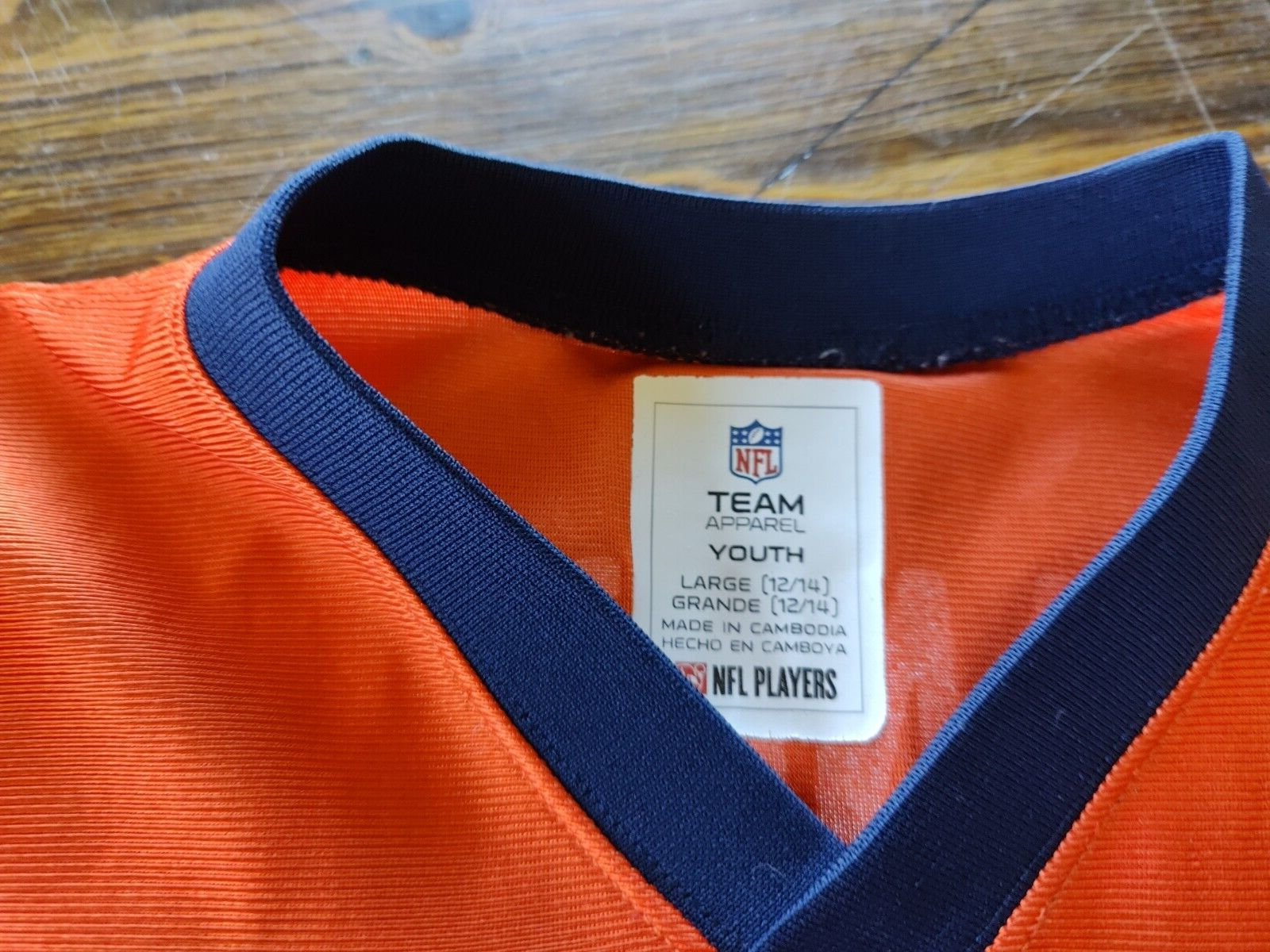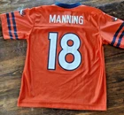 Support your Denver Broncos with this officially licensed NFL Team Apparel Peyton Manning Broncos NFL Jersey #18. Made for the unisex children with a size of Youth Large, this jersey is perfect for any young fan of the Denver Broncos and Peyton Manning. Grab this jersey now and join the millions of NFL fans who support their teams with pride. Average preowned condition. Some of the white areas have worn through and there are a few areas where the fabric has snagged.