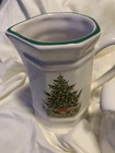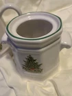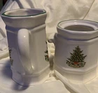 Elevate your holiday table setting with the Pfaltzgraff Christmas Heritage Cream & Sugar, Salt & Pepper set, and Napkin Holder. This set includes five ceramic pieces, each adorned with a festive Christmas pattern that brings warmth and vintage charm to any dining occasion. The glossy finish and artful design exemplify the quality craftsmanship of the 1980s era, made in the United States. Whether hosting a formal dinner or enjoying a casual meal, these pieces serve as both functional and decorative additions to your collection. The set features a creamer, sugar bowl, salt and pepper shakers, and a napkin holder, all coordinated for a touch of elegance and convenience. Perfect for those who appreciate the timeless beauty of Pfaltzgraff pottery. The top of the sugar bowl is missing, as shown in the pictures.