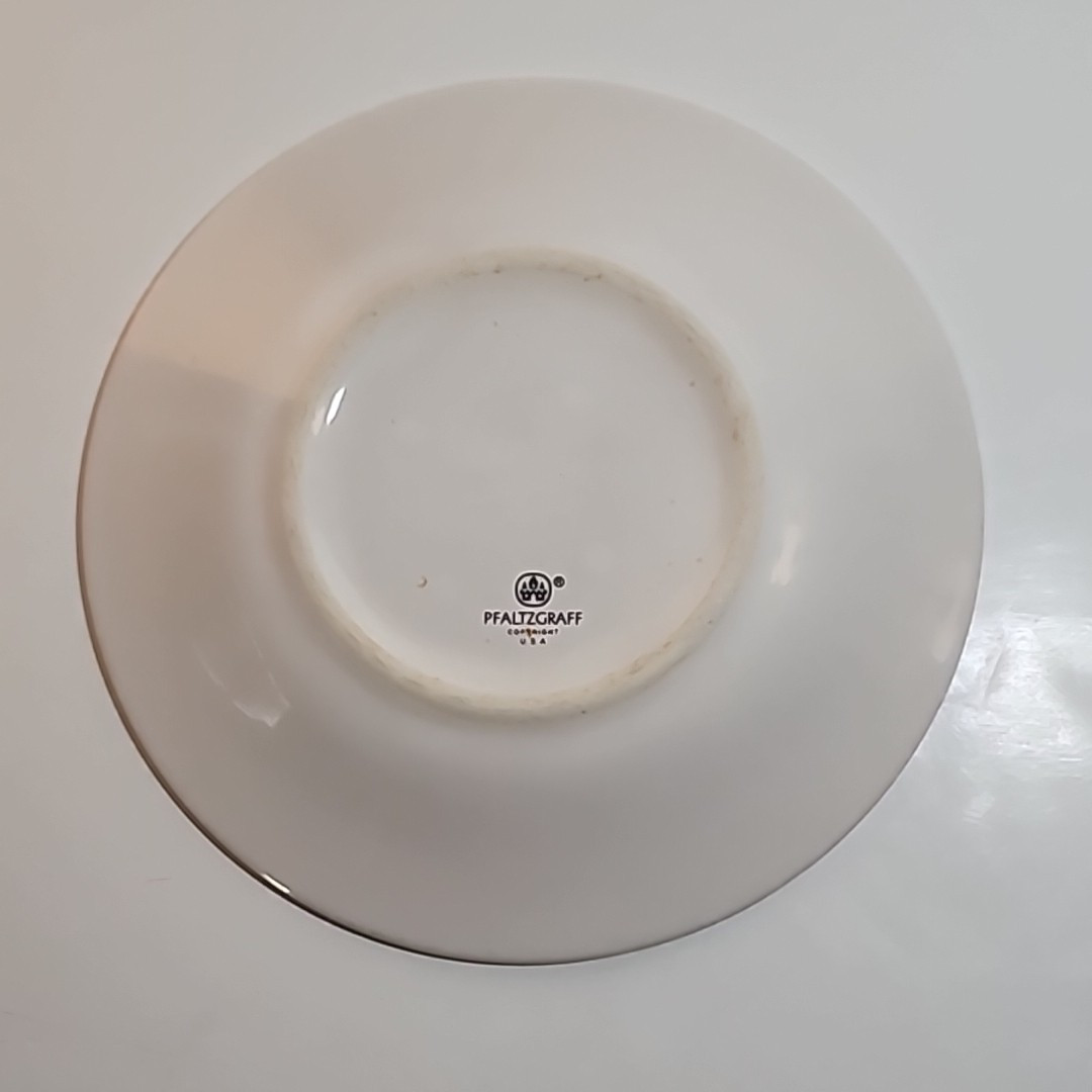 The Pfaltzgraff Arbor Vine Salad/Dessert Plate is a vintage piece made in the USA in 1999 as part of the Arbor Vine collection. It features a white stoneware plate with a design of red flowers, green leaves, and a blue border, giving it a charming and elegant look. This retired plate is 7.25 inches in size and is a part of the Pfaltzgraff brand known for its high-quality dinnerware and serveware.