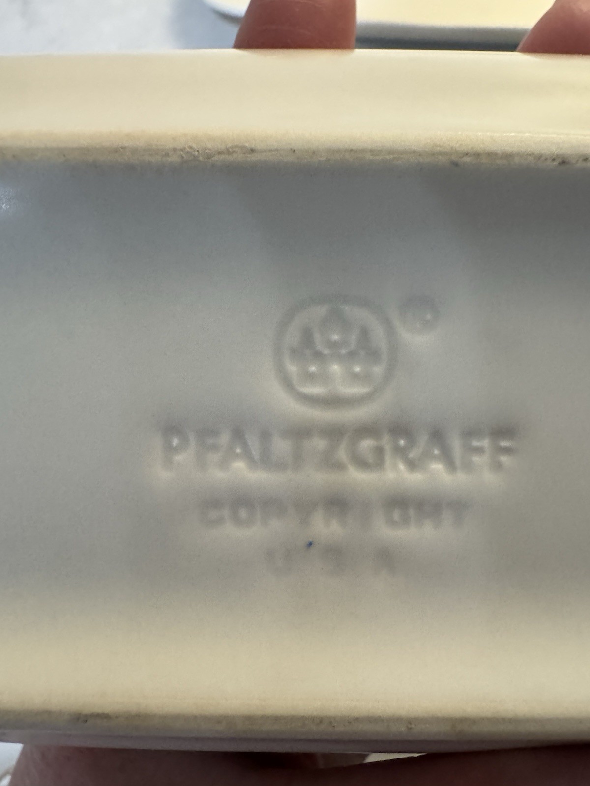 The product is a set of two Pfaltzgraff Basketweave Oblong Cheese Cracker Corn Cob Hostess Trays. Made in the United States, these stoneware trays feature a cream color and a matte finish. They are original pieces from the 2000-2009 time period, with an impressed backstamp indicating their authenticity. These vintage original serveware items are perfect for serving crackers or other snacks at the table or during gatherings.