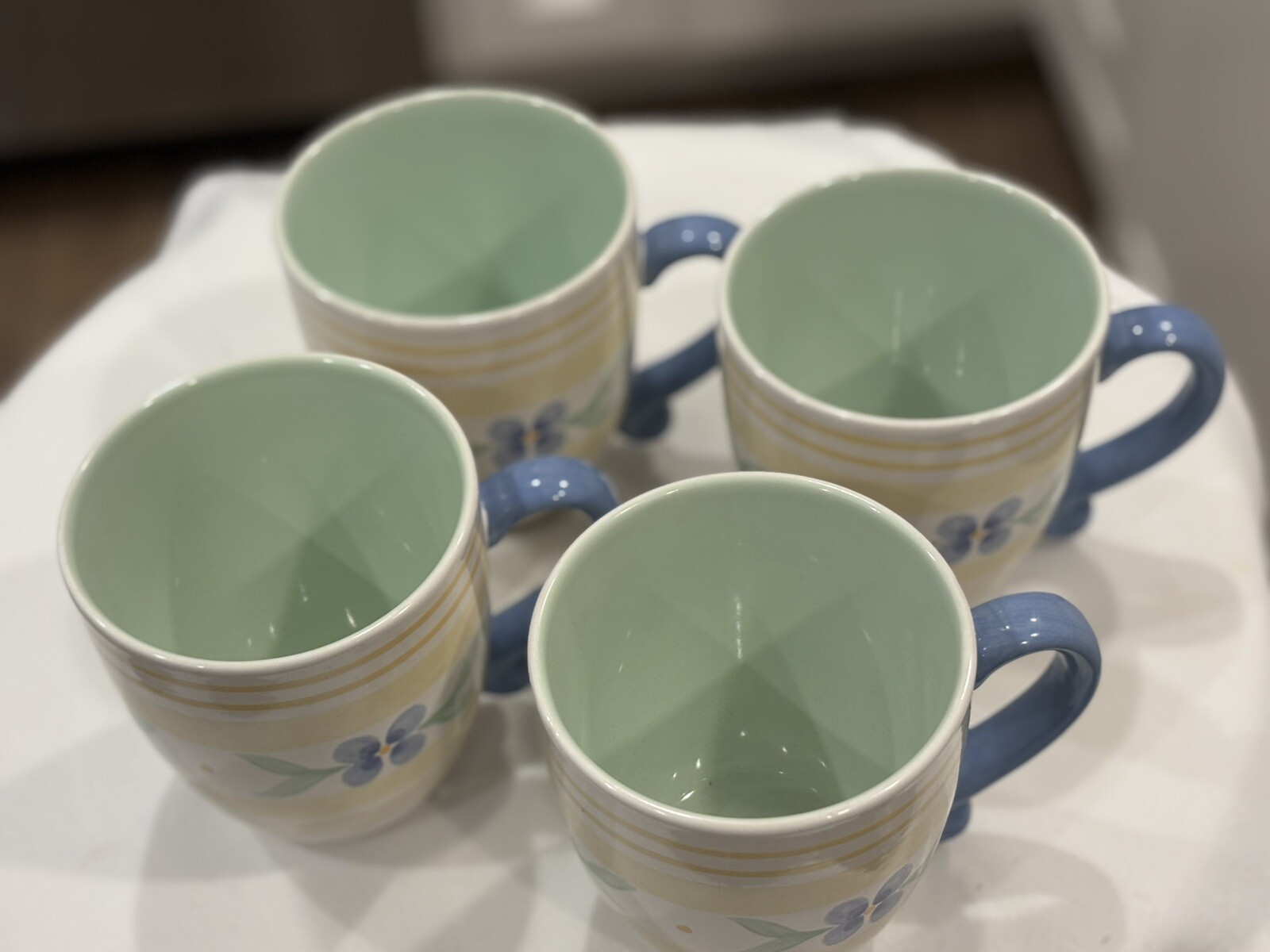The "Summer Breeze" Pfaltzgraff Mugs Set features a vintage Four-Piece collection of round mugs with a capacity of 14-16 oz. each. Manufactured in 1990, the mugs are decorated with a colorful floral pattern of blue flowers and yellow plaid trellis, adding a touch of summer charm. These contemporary-style mugs are microwave and dishwasher safe, making them convenient for everyday use. Crafted from stoneware with a glossy finish, these mugs are a delightful addition to any table setting for all occasions. Return accepted within 30 days; buyer pays return shipping Thank you for your consideration