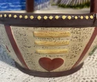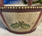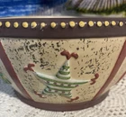 Pfaltzgraff Ceramic Bowl with Handle features a festive design of stars, hearts, holly, and berries, perfect for Christmas or all occasions. The round bowl is approximately 9 3/4 inches in diameter and 4 1/2 inches deep, with a height of 9 inches. This vintage limited edition piece is hand-painted and handmade, crafted from ceramic with a semi-matte finish. Ideal for decorative use, it is recommended for hand wash only. Made in China by Pfaltzgraff. All reasonable offers will be considered. Please see pictures for the exact items.