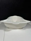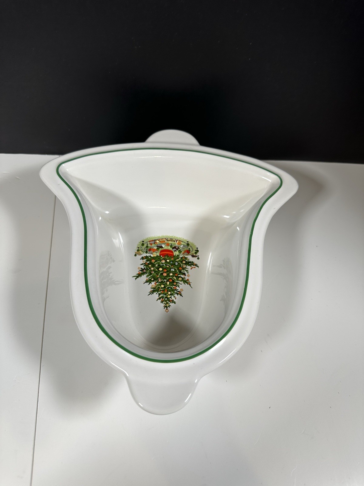 For sale pre-owned and vintage bell-shaped bowl made by Pfaltzgraff in the USA from 1981-2006 for the Christmas Heritage product line. This stoneware bell shaped bowl has a glossy cream-colored background featuring a decorated Christmas tree on the bowl face. The bowl is trimmed with a green line around the border of the bell shape. This is a discontinued pattern. Should be hand washed. Details: 11 inches long 9 3/4 inches wide at the widest area 2 3/4 inches high 2 pounds 1 ounce weight Hand wash only