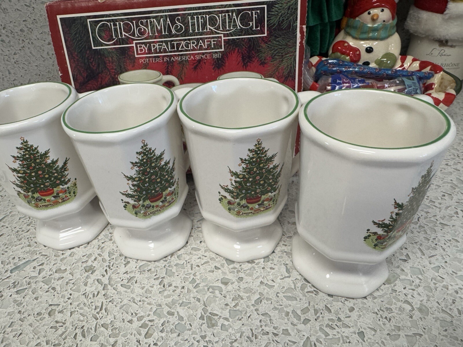 All four are excellent condition Celebrate the holiday season in style with this beautiful four-piece mug set from Pfaltzgraff's Christmas Heritage collection. Each mug stands at 5 inches tall and features a festive multi-color design that is perfect for any holiday occasion. Crafted from vintage original materials, these mugs are both durable and stylish. They are easy to clean and care for, making them a great addition to any kitchen or dining room. Whether you're enjoying your morning coffee or hosting a holiday party, these mugs are sure to impress. Add them to your collection today! Please see all photos Smoke Free Home Always happy to combine for shipping savings I also have three additonal of this pattern listed for individual purchase if you need more than four