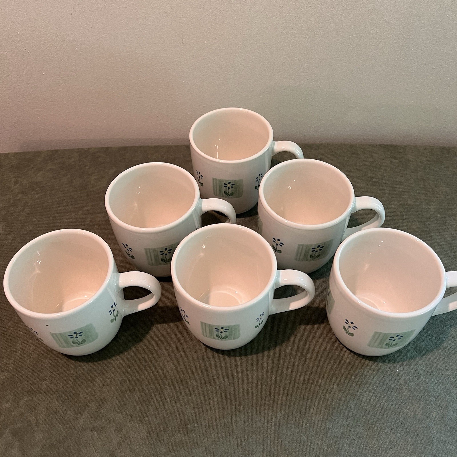 The Pfaltzgraff Cloverhill Floral Tea Cup Coffee Mug Set of 6 is a stylish and contemporary set of round mugs with a floral pattern in cream and shades of blue and green. Made of stoneware and ceramic, these mugs are machine washable and have a glossy finish. With an impressed backstamp, these original mugs are perfect for all occasions and are proudly made in the United States. This set is a lovely addition to any kitchen or dining area for enjoying a relaxing cup of tea or coffee.