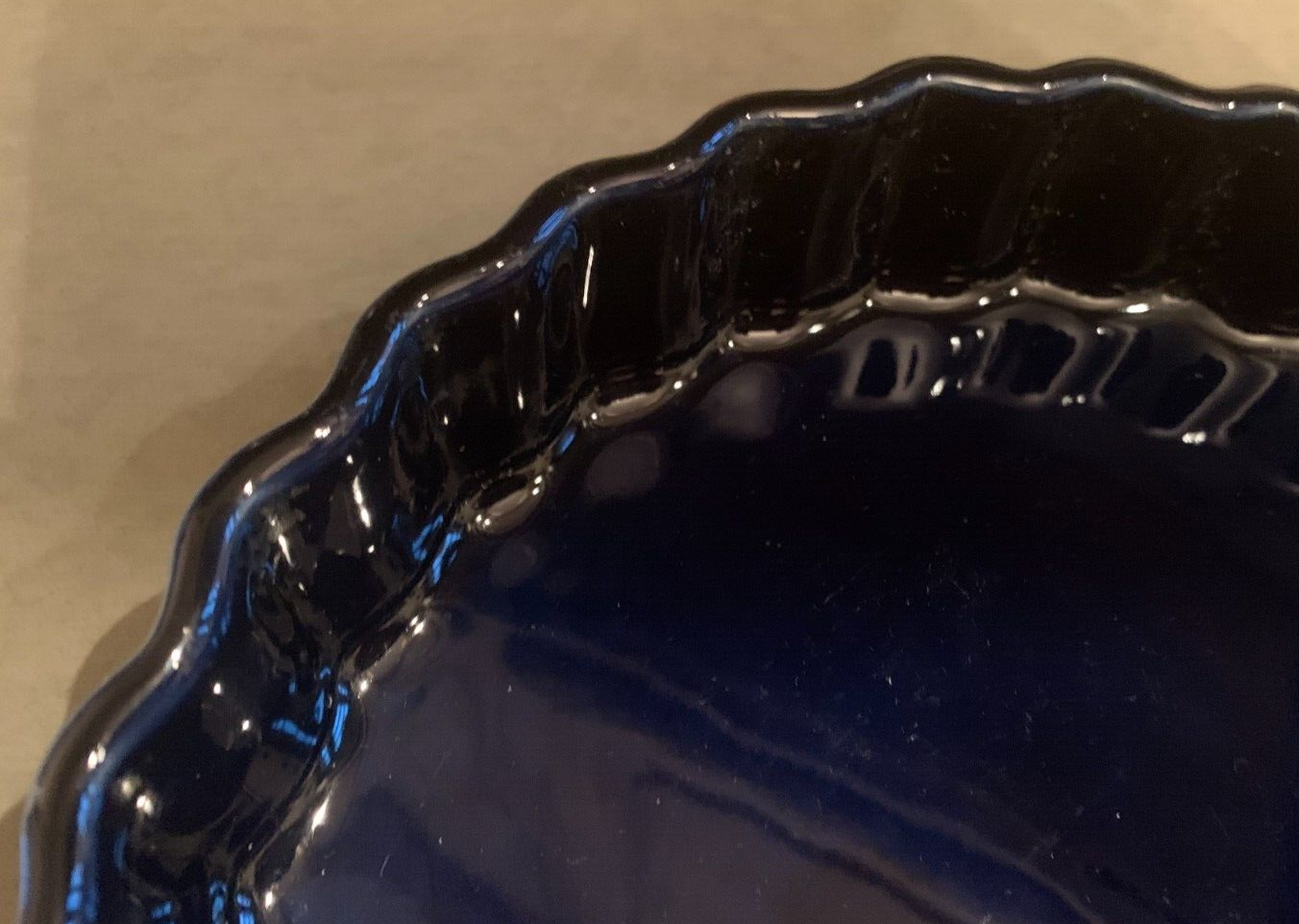 Gorgeous vivid cobalt blue! Offered is a 9" glossy finish quiche/pie/baking dish with crimped edges interior and exterior. This dish is in excellent condition. Please note in the last two photos the process of artisan pottery produces natural ceramic markings, drips. Measures 9" diameter x 2" deep. Fast shipping, quality packed, smoke-free household, trackable. Thanks for looking :)